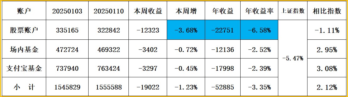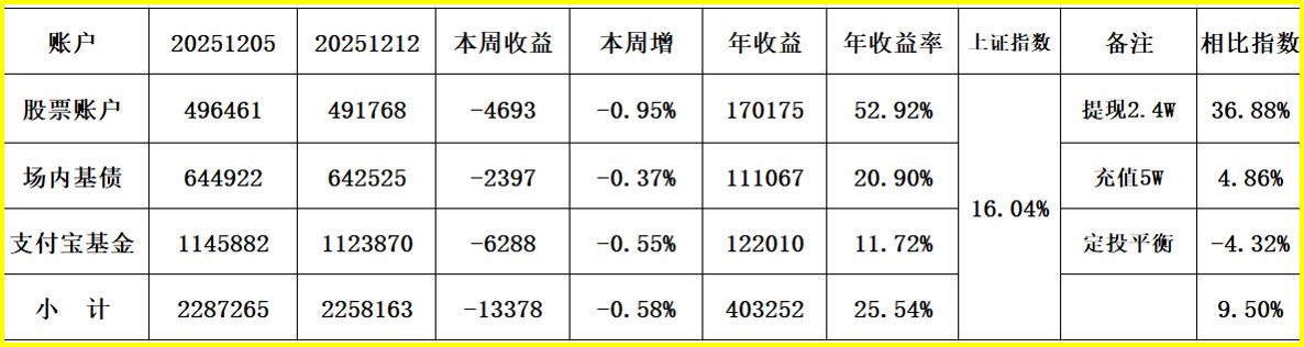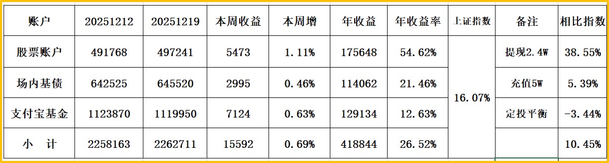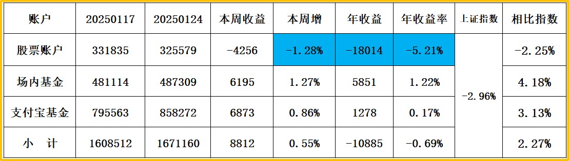 1、股票账户:周+1.27%,+5202元,年26.56%(9.178W); 仓位88%