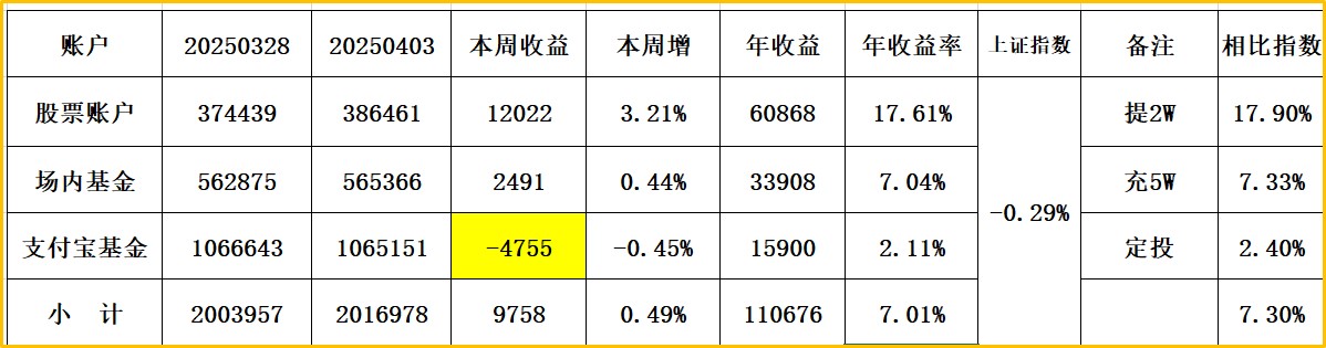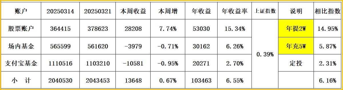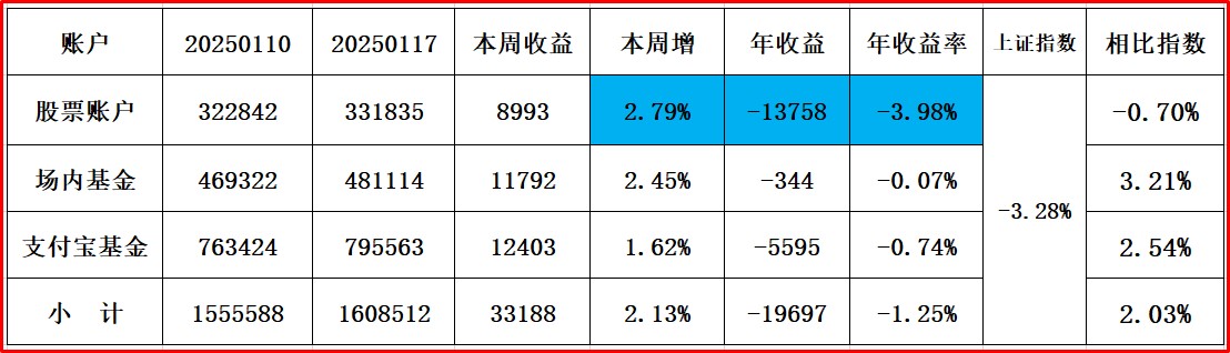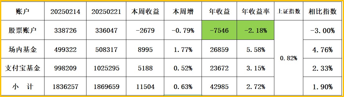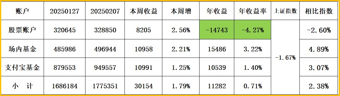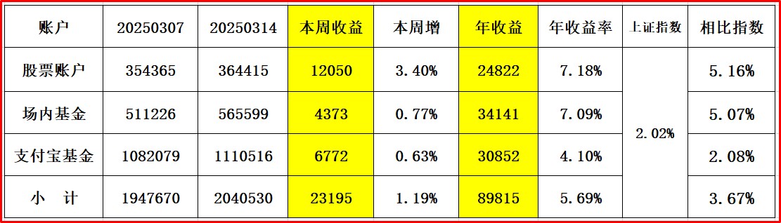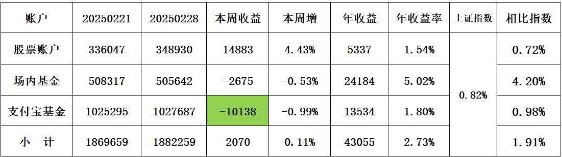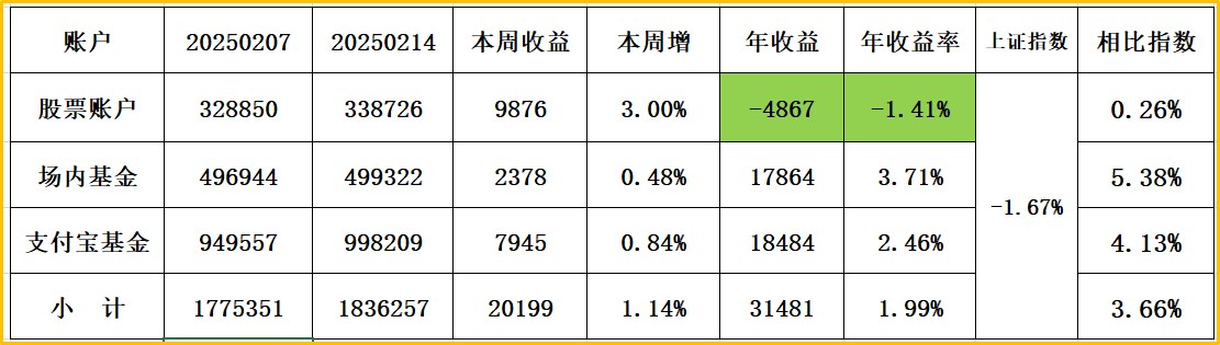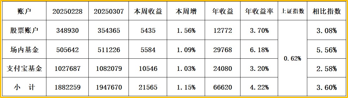 上证指数收:3593,周涨1.67% 股票账户+3.82% 场内基债+1.37% 支付宝1.12%