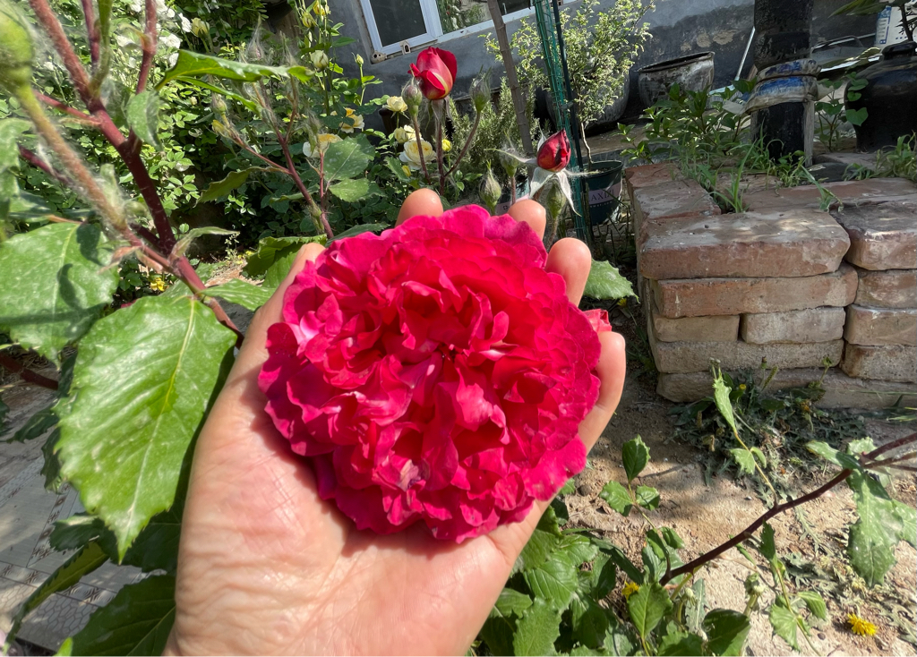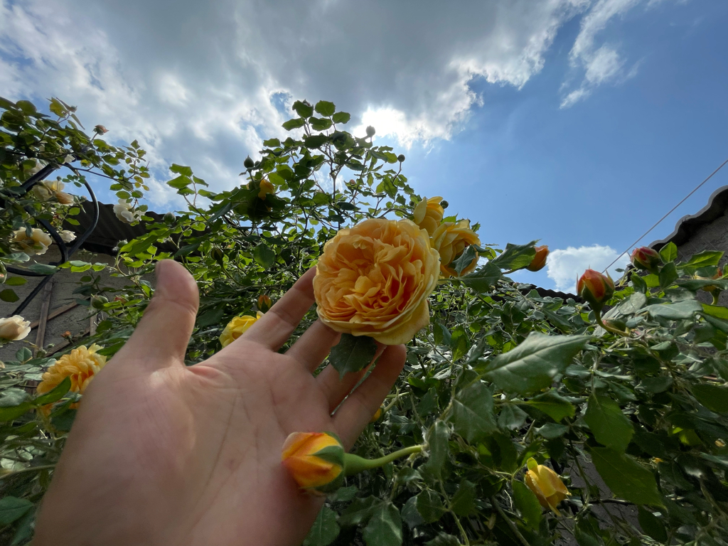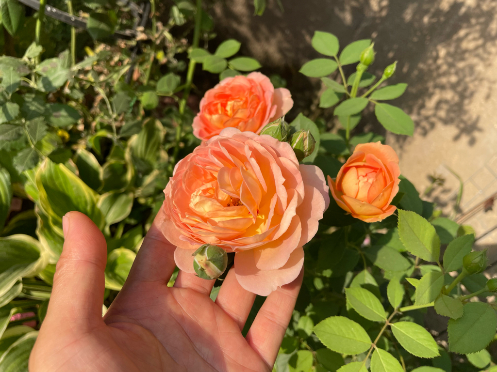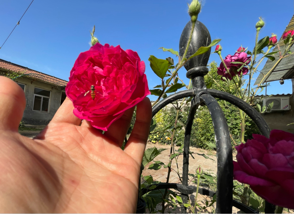这些月季里的颜值担当和香气担当,一夜之间竞相盛开,小小的院子里浓香弥漫,蜂喧蝶舞,黄金庆典是一个既美又香的经典品种,下图我手托的花就是他
