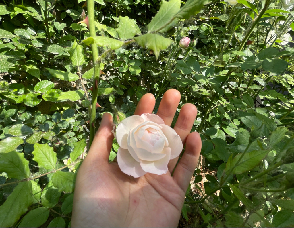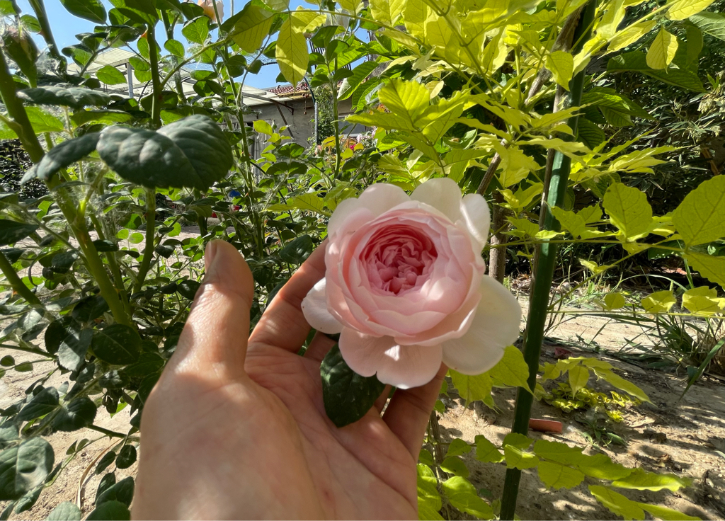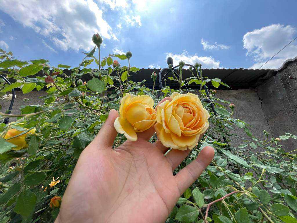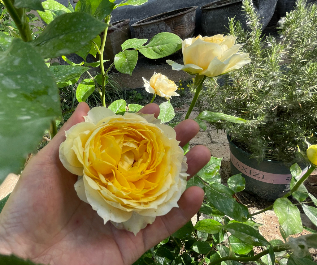 这些月季里的颜值担当和香气担当,一夜之间竞相盛开,小小的院子里浓香弥漫,蜂喧蝶舞,黄金庆典是一个既美又香的经典品种,下图我手托的花就是他