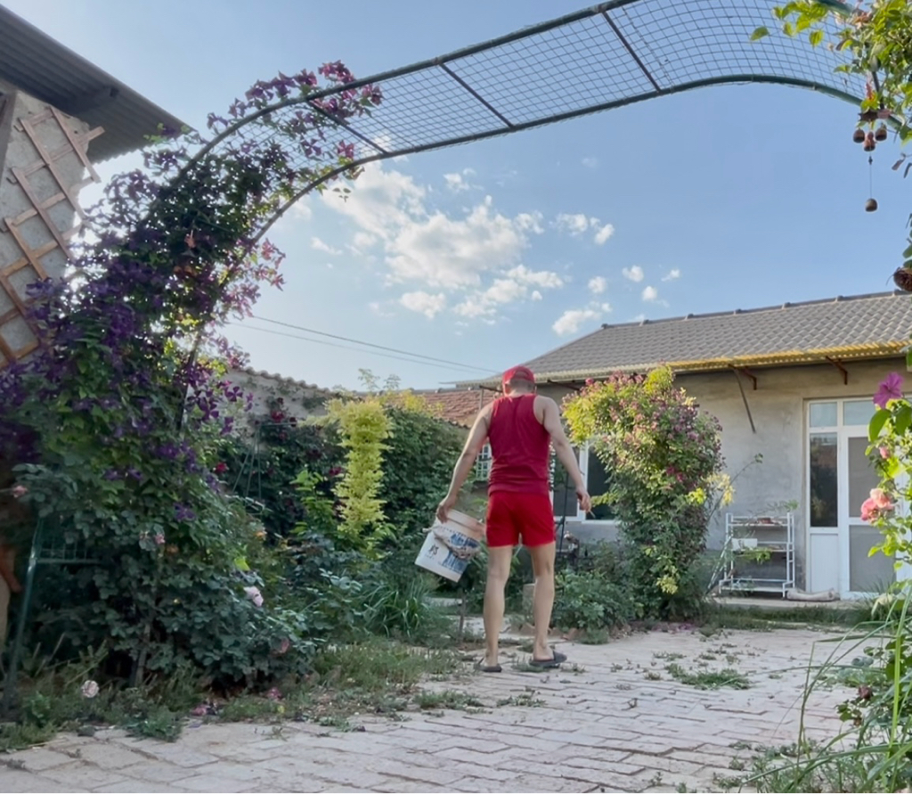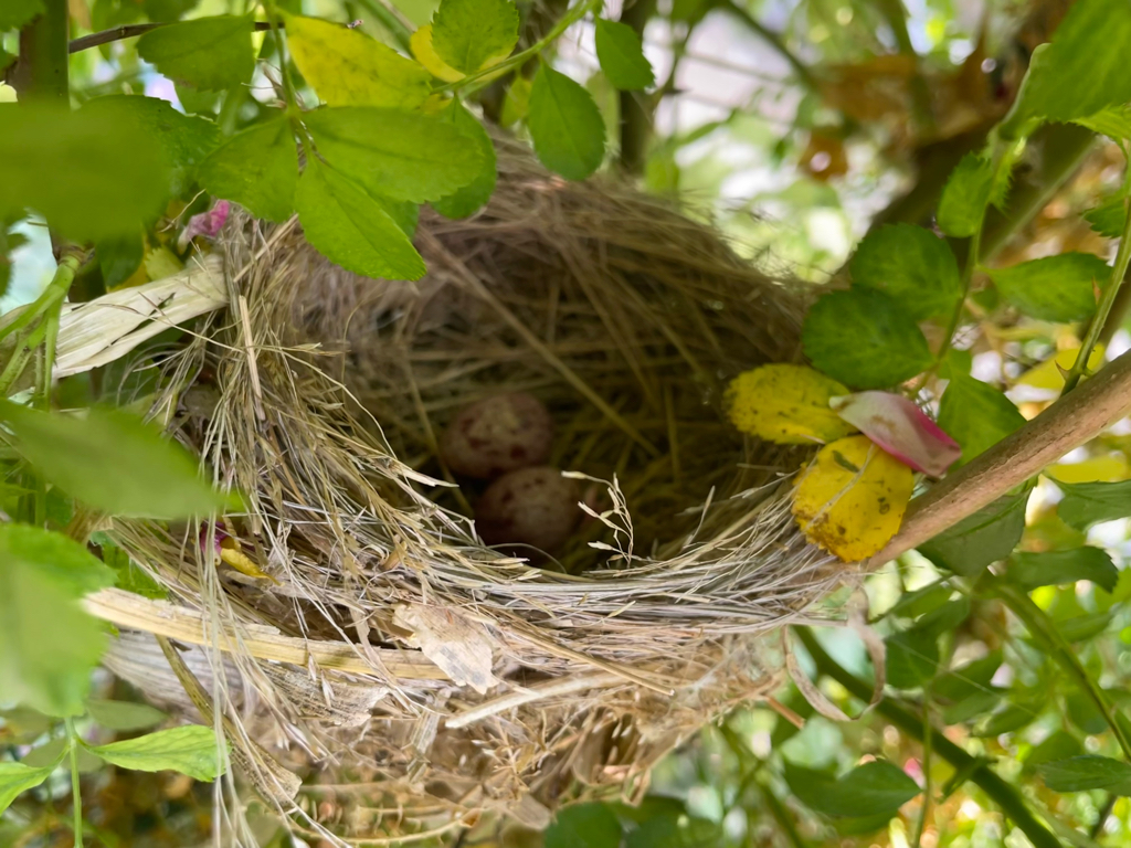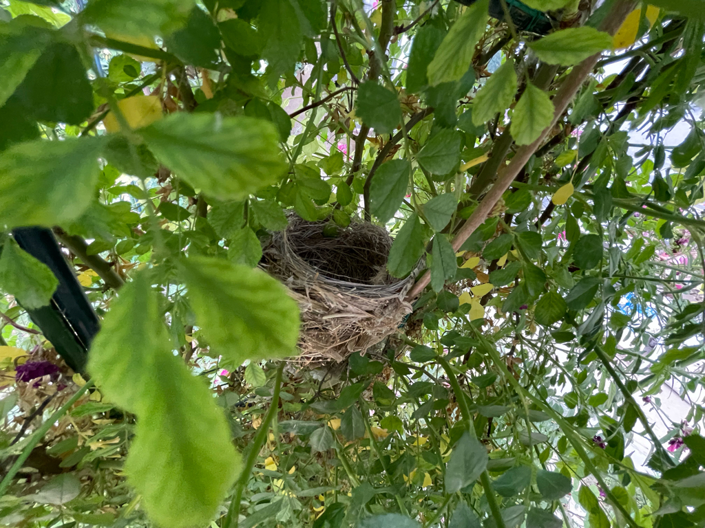 这两周里,鲁北还经历了两场跨夜雷雨,风急雨大电闪雷鸣,他们筑巢在我给蔷薇搭建的临时花架里,这个花架只是临时用用,非常不结实,有点风就摇摇欲倒,我今春本来约好了当地的手艺师傅给我院子里打造一套镀锌方管的结实花架,但因为各种原因这件事被推迟到了秋后,这个简易花架今春被蔷薇和紫藤缠绕之后,互相拉扯支撑,虽然不甚牢固,倒也坚韧难垮,我也就犯懒没及时更换