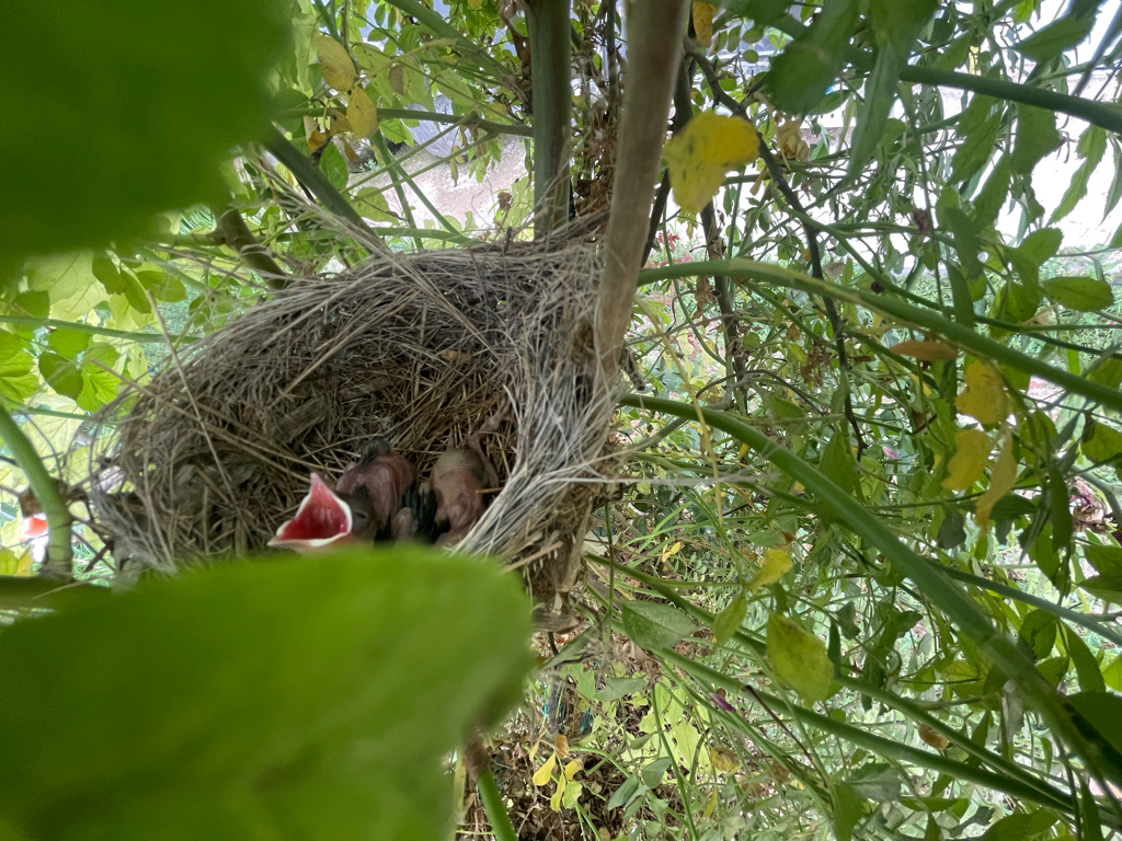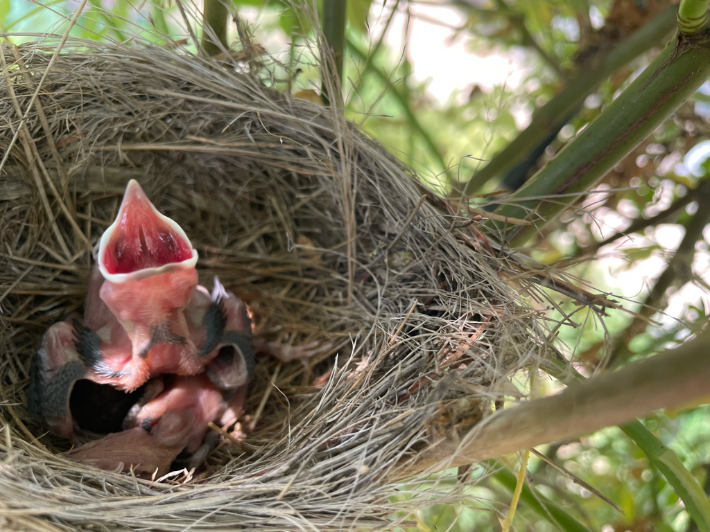 午间高热,两只成鸟往返育雏的频率会降低,我趁机偷拍了一下鸟巢:果然,所有的小鸟都破壳而出了,这两只成鸟真是了不起的父母,在这么被频频打扰,又经历大雷雨的环境里,完好无损的把自己的后代孵化成功了
