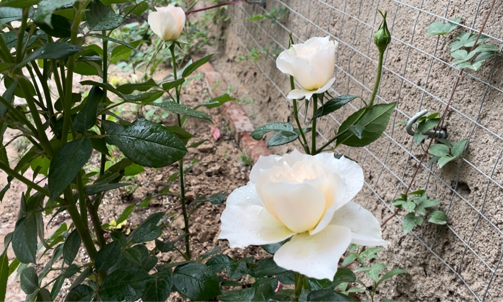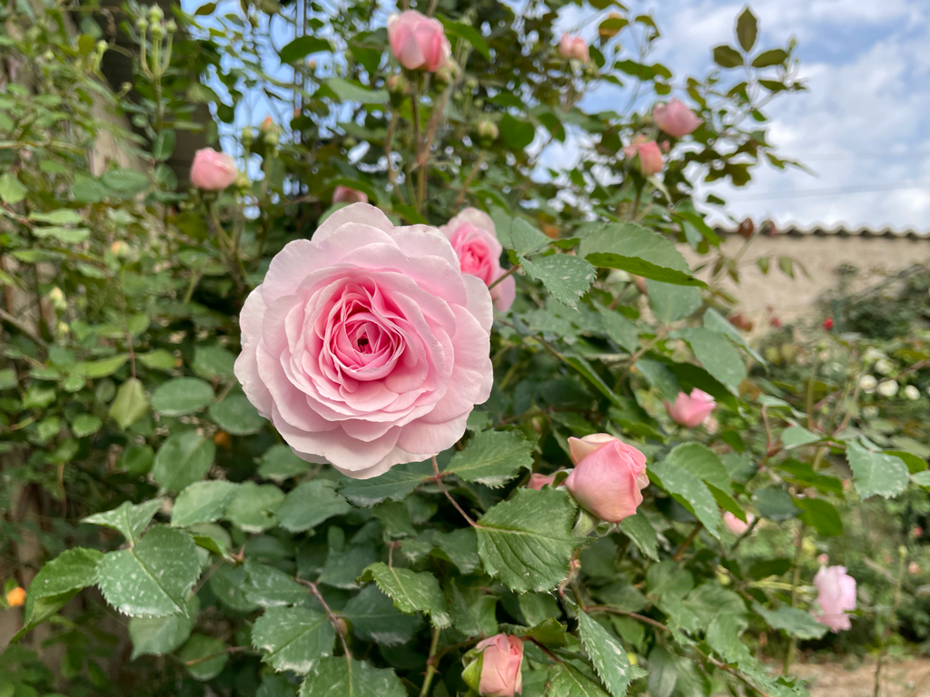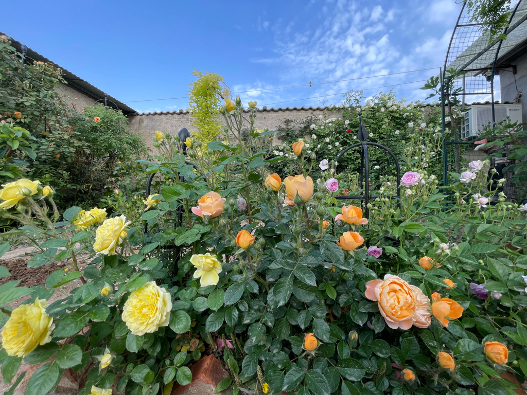 种在院里的几个藤本,都是大名鼎鼎的名品:玛格丽特王妃,夏洛特夫人,自由精神,粉色龙沙宝石和几个小型藤本如粉达和亚伯