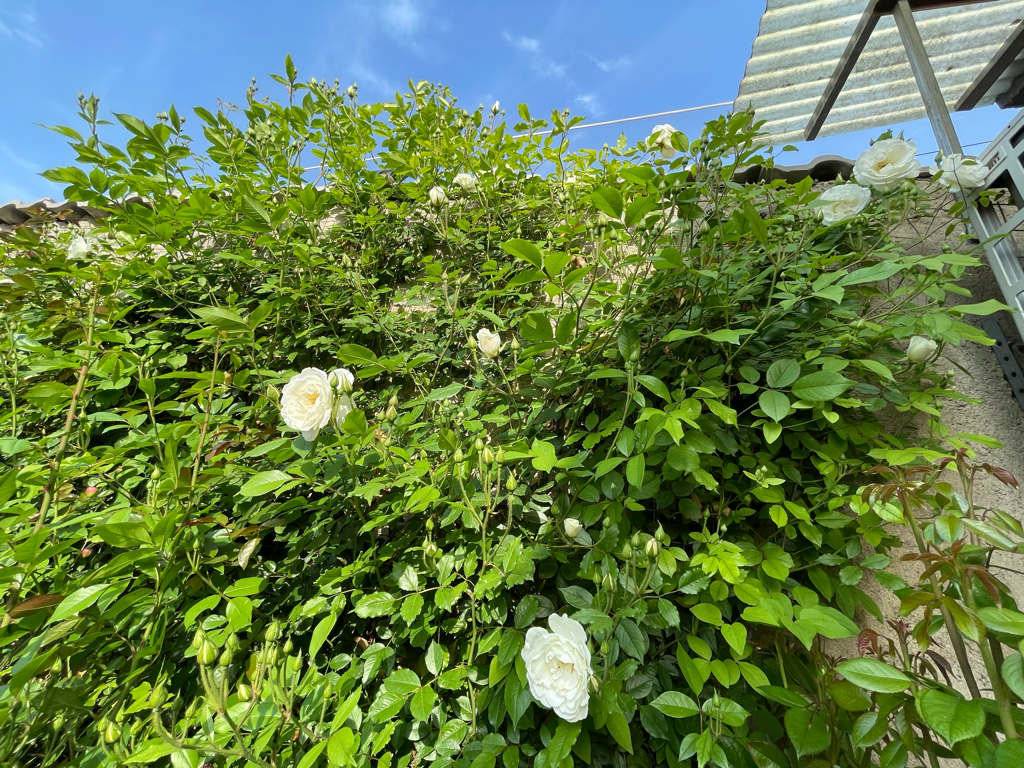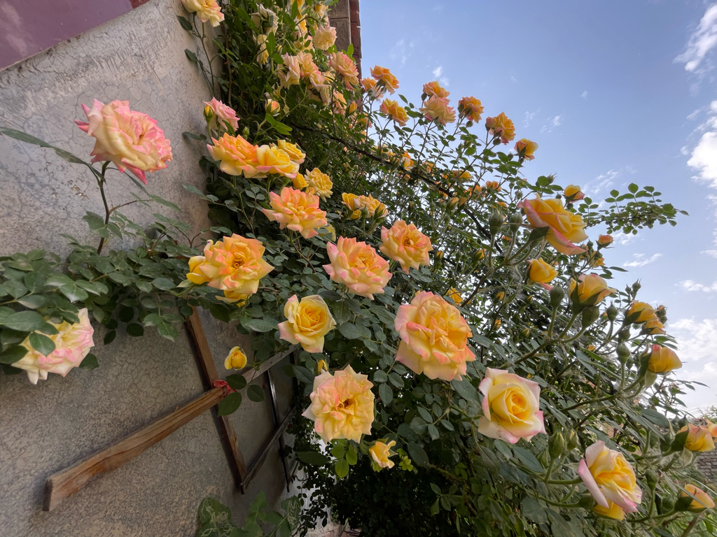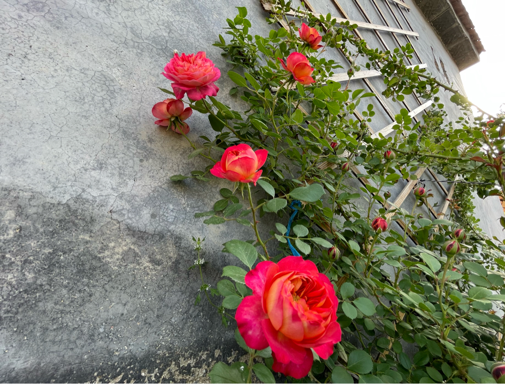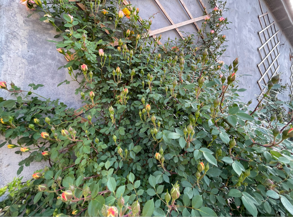 院里这棵藤冰山是去年春季种下去的牙签苗,能想象吗,仅仅一年的时间,今春他已经长成了一棵就铺满半面墙的大苗,藤冰山属于大型藤本月季,假以时日是可以独株成景的绝美存在