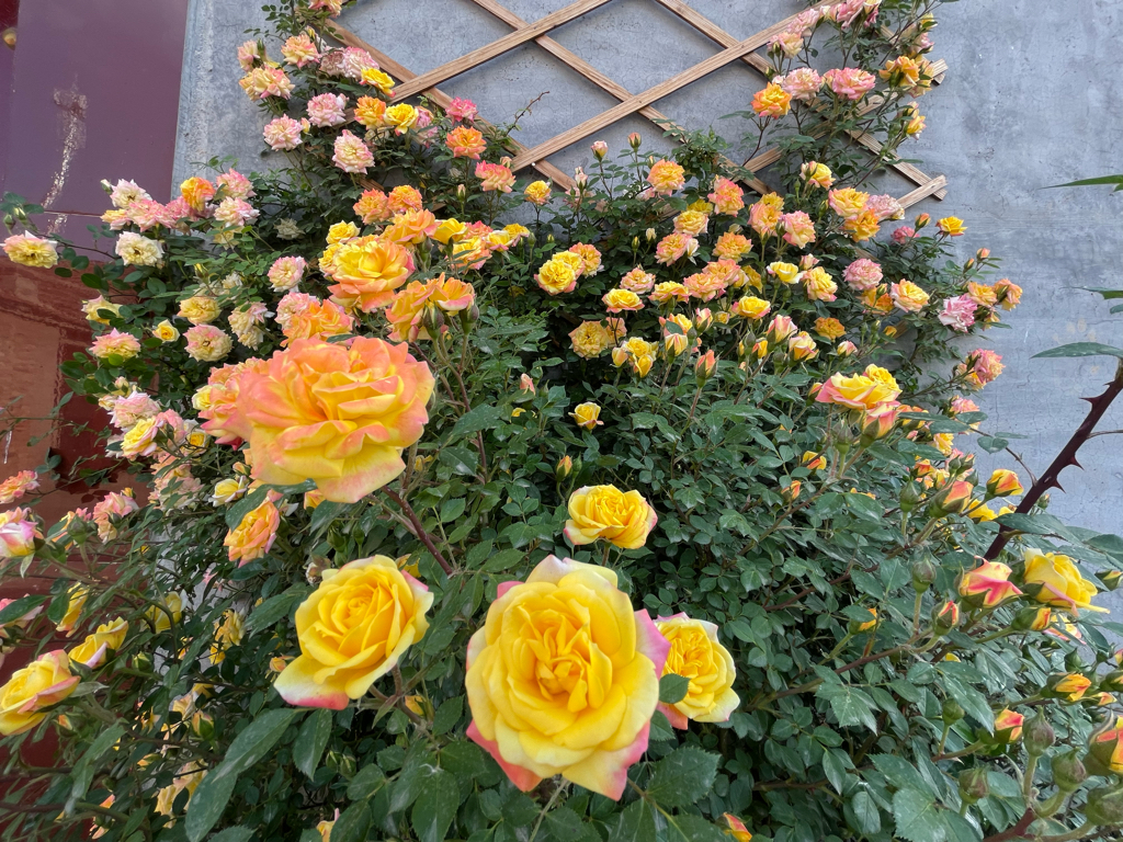 最早批量开花的,是藤本月季“藤冰山”,这个品种很多花友都推荐过,大花多头浓香,是非常优秀的一个品种