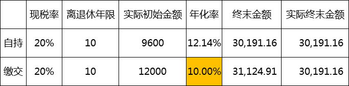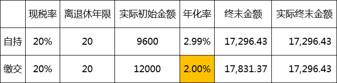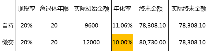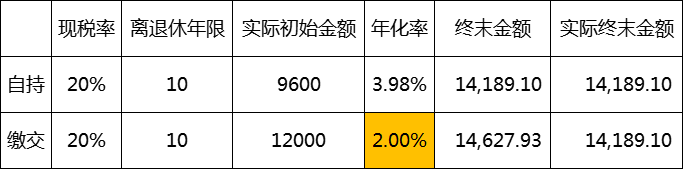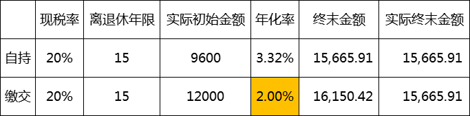 个人养老金,按一般20%顶峰税率,距离退休15年算,如果自持或者缴交(前提是在退休前,都不会使用此资金),假如等到退休时,需要得到相同的收益,自持需要的收益率,比缴交都会高,就算选2%的存款,自持也需要3.32%的年化收益率,如果缴交的年化有10%,那自持需要11.42%的年化,才能最终达成和缴交一样的数额。