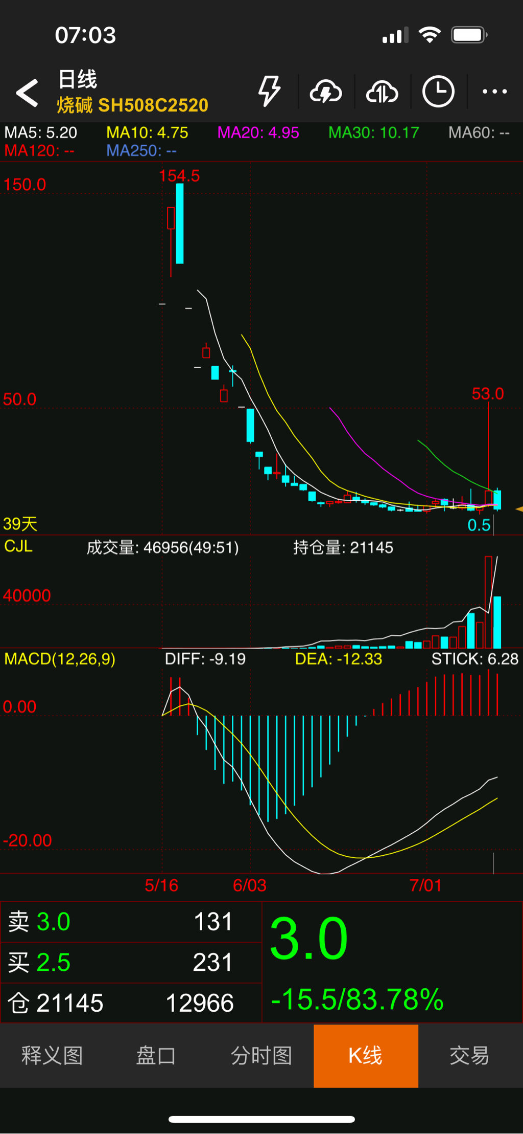 对我来说,没有时间精力盯盘,那么选择就是加大周期做长线,方向也简化为只做多。卖沽抄底后续有接到货变期货多头和接不到货卖沽期权盈利两种情况,烧碱就是属于没接到货的。反弹涨起来了想追高又怕调整怎么办?就可以使用风险逆转组合,卖沽变虚值已经盈利了,可以增加虚值买购,例如这次我买购烧碱5250。这个组合的好处就是大涨可以跟上,小幅回调震荡也不会因为追高期货而被套陷入被动。买购的问题就是止盈机会的把握。