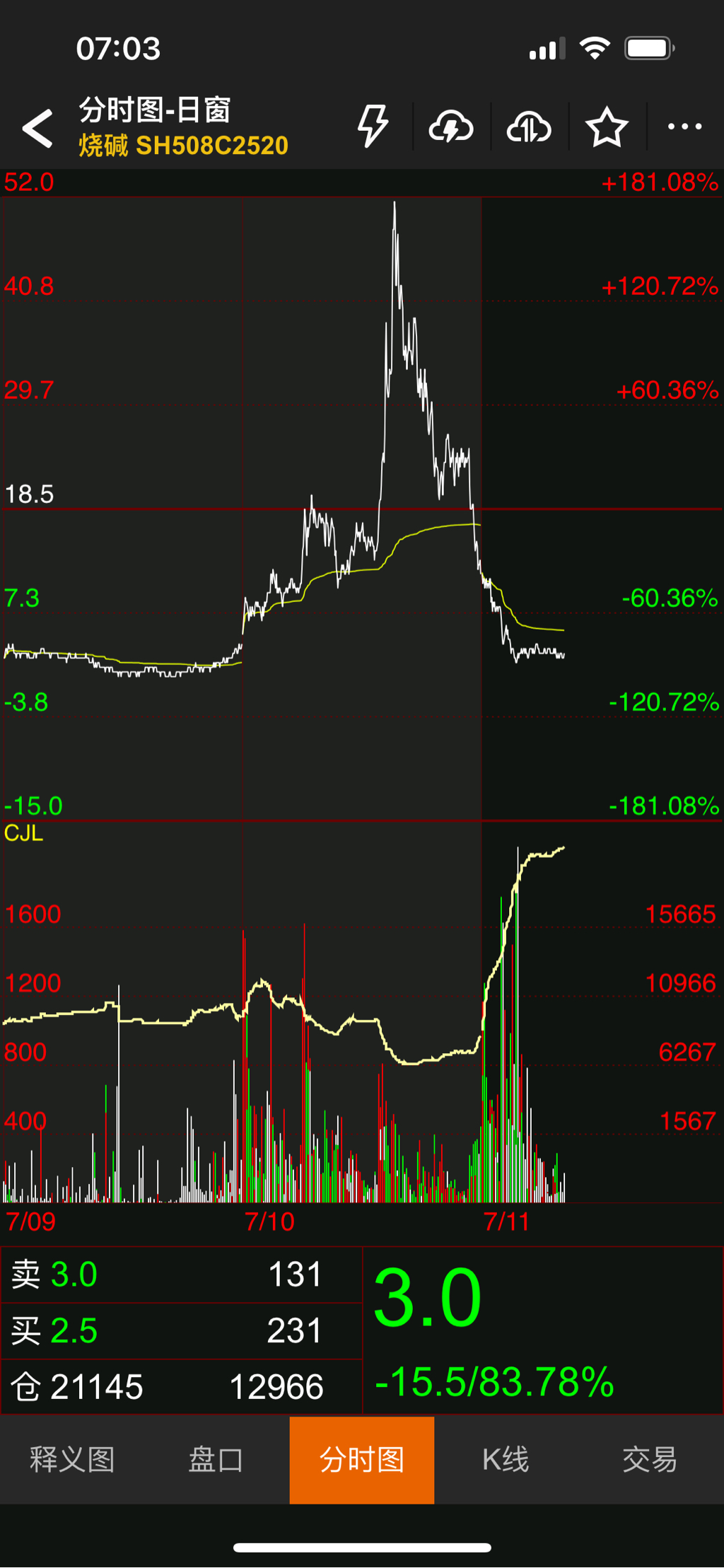 实战中商品的反向比例价差持仓体验并不会太好,大部分时间大部分的波动都是不够的,行情出来了又会走得很快,买购止盈的交易机会很可能稍纵即逝。等你看到了已经错过了这个小尖尖,例如昨天的烧碱期权末日轮。我有但是没能盯盘抓到最好的位置止盈。