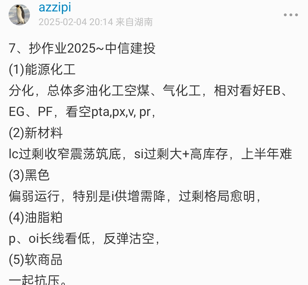 9、2月期货信息梳理整合:sr、年度产量预估+10%,累计产量749吨同比增加163万吨。cf、年度产量预估+10%,c、a等变化不大。ur、出口受限高开工高库存需求疲软、p、临时需求减产末期拉涨,3月后价高需少或调整sa、24高库存产能又增需求不振,承压或亏损反弹l/ l/ v/pp、上涨动力不足,底部震荡寻底lc、1-2年内供应过剩价格走势/国际上,原油走弱到70刀,白银没冲破24.10的高...sr天气因素预期产量下调而上涨,但中长增产周期不变,现价5980/