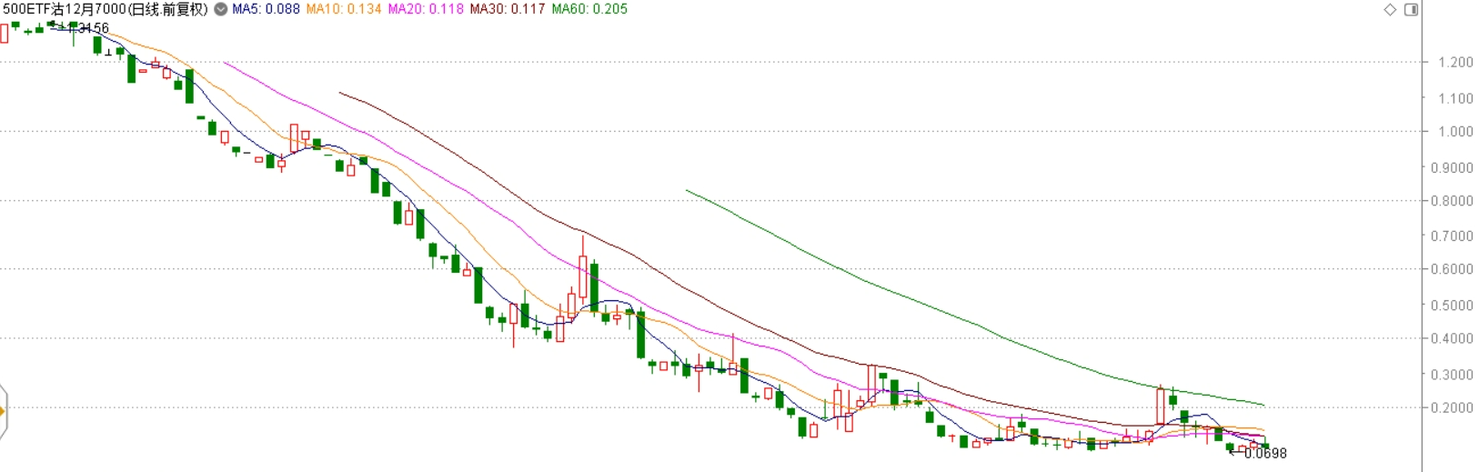 我把自己的多头合约K线图12M7000P也放上来。如果结合前面一张认购K线图,可以发现,虽然它们是方向完全相反的两个对立合约,但却有一个共性:到期收敛。这就是期权卖方安全垫的真实体现,也等于给交易者在走势判断上设置了容错空间。