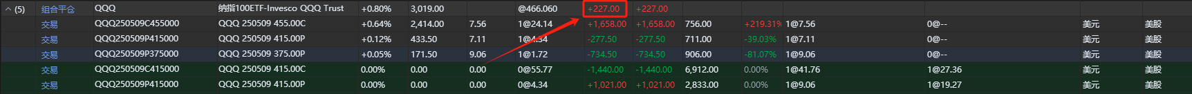 昨晚应对比较好,看到涨幅比较大,及时亏400美元平仓双卖仓位,留下了双买仓位,并在ETF涨到460元的时候,在执行价415的位置买了1手PUT(成本7.11元),这样手上就留下1手买call@455和2手买PUT(@415,@375),进可攻退可守了。目前这组铁鹰是总体盈利227美元的。