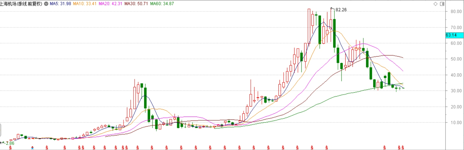 我把上海虹桥机场的K线图也放上来。乖乖,指数4000点,这个股价居然还在低位区域,和顶部相比腰斩还多!就资产价值而言,机场和机场外那个小区是双输了。