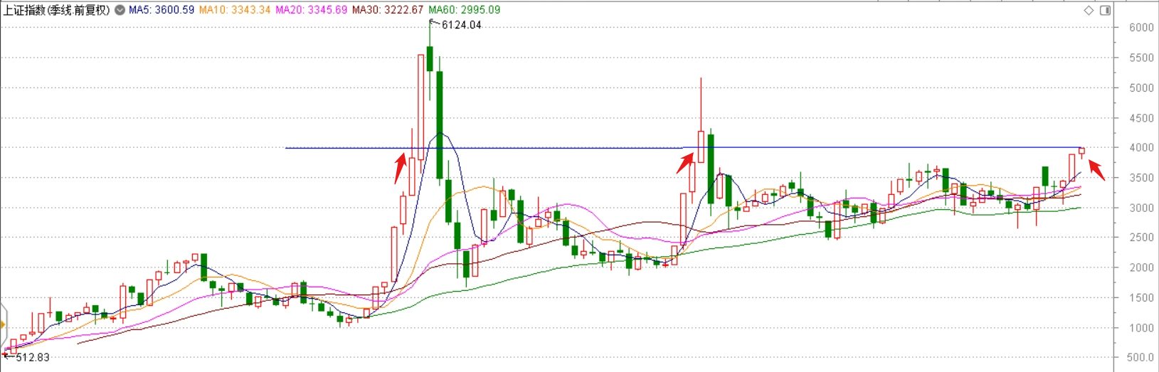 这是上证指数的季度K线图。十年前我们看到的著名观点:突破4000点是牛市起点。理论来自这样的逻辑:指数上行突破4000点之后,上方几乎没有套牢盘,因此意味打开了上行空间。可是没有套牢盘等于全部都是获利盘呀!因此打开上行空间就要求所有人获利而不兑现,还要有更多的场外资金来抬轿。用这样的理论来推导就可以得到一个结论:股市越涨越安全!