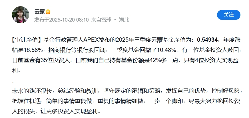 在雪球网看到了高杠杆投资银行股的私募基金经理“云蒙”的帖子,今年的业绩跟上了300指数,Q3的回撤超过10个点。