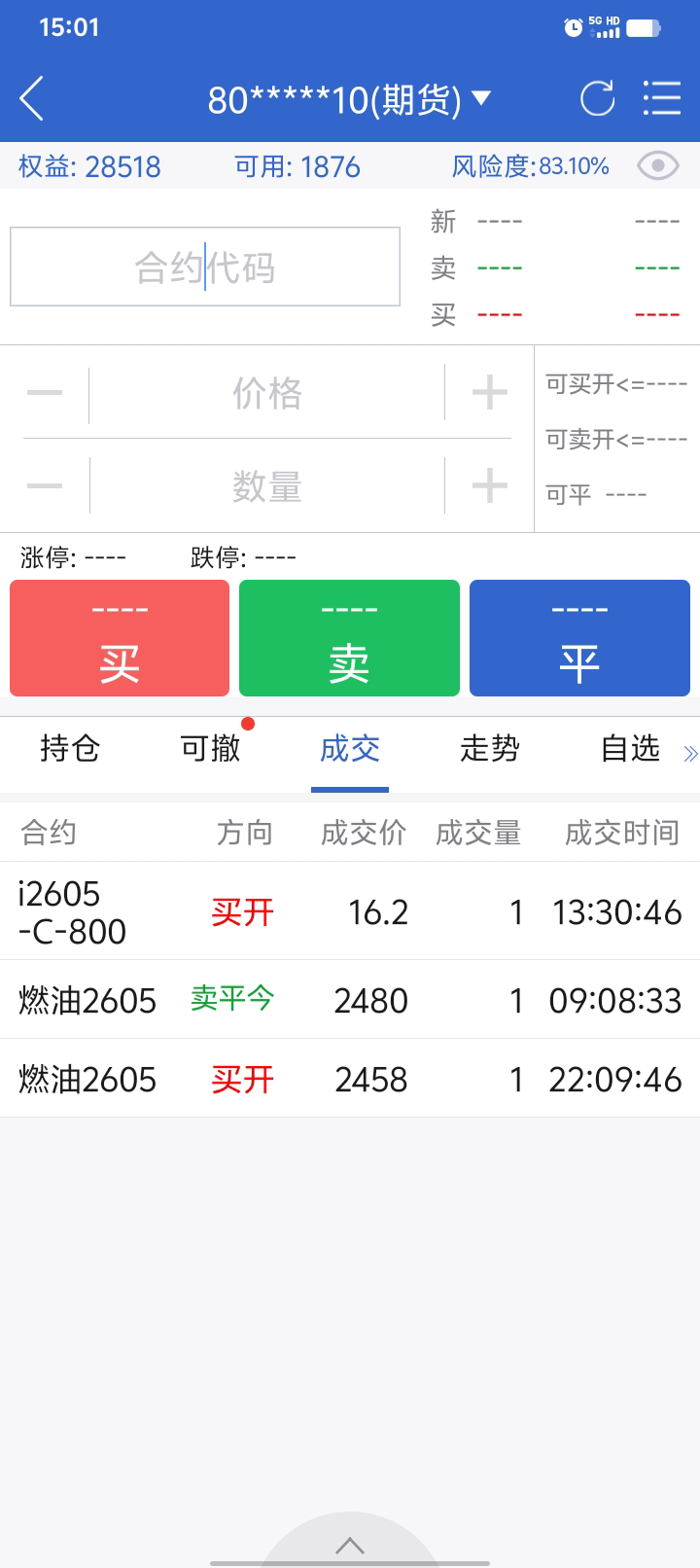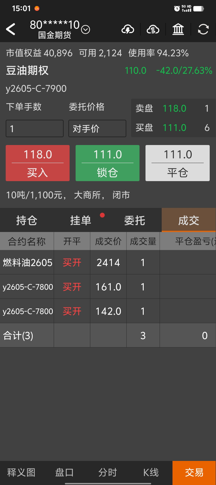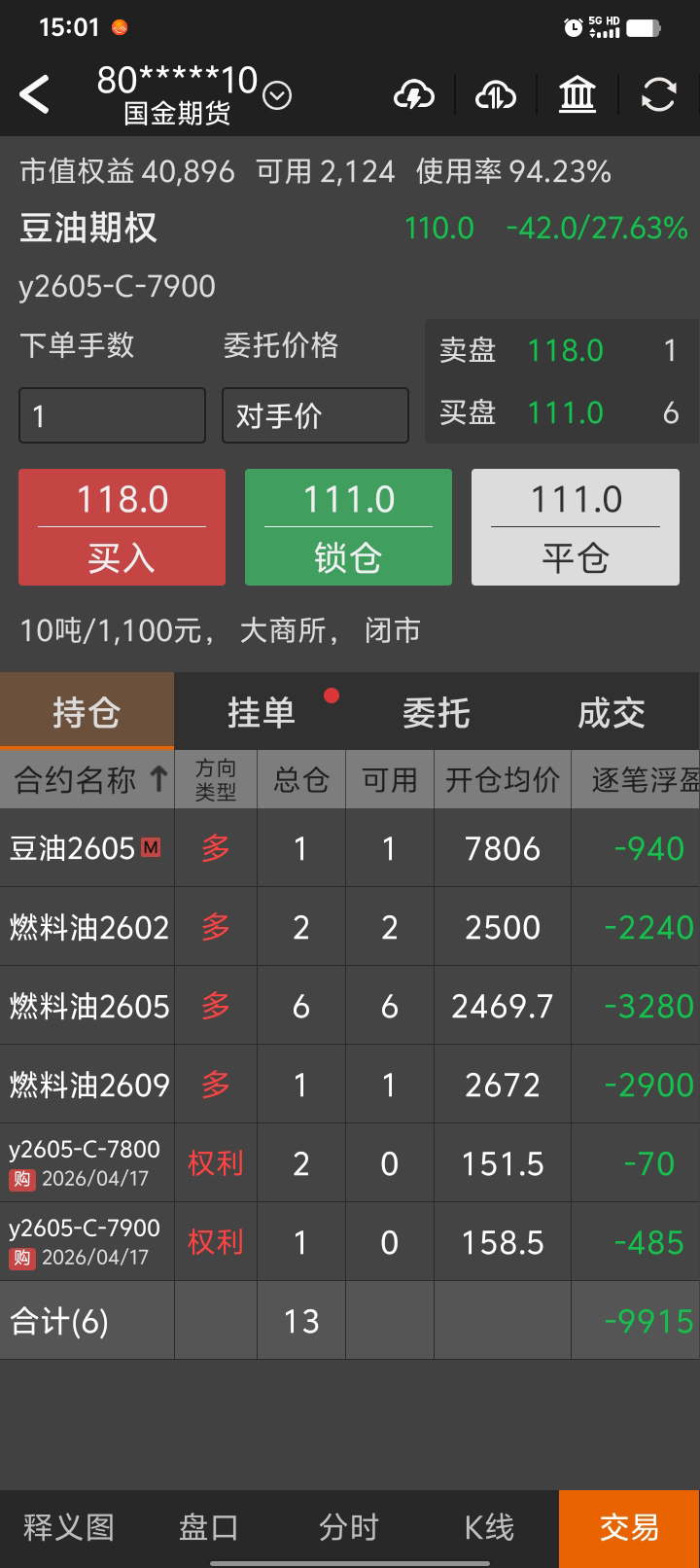 都按计划了,2428出油02,以2702计,亏2750。把01和02这四手清完估计亏1万块左右,捂脸。铁权21.3出,16.2进,正500块。112清油权,139进,亏280块,换7806油05一手。