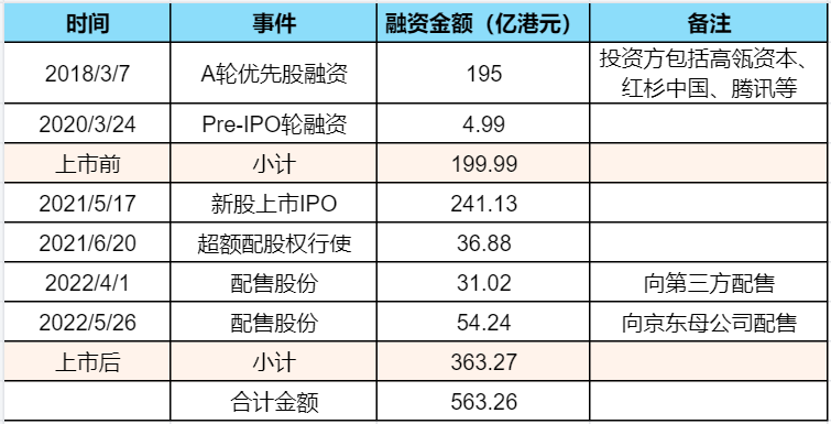 在上市前,京东物流通过优先股融资了195亿港币,2020年上市前又融资了5亿港币。上市后,通过IPO、超额配股权行使以及两次配售,股权融资总额超过360亿港币。因此,上市前后总融资金额超过560亿港币。