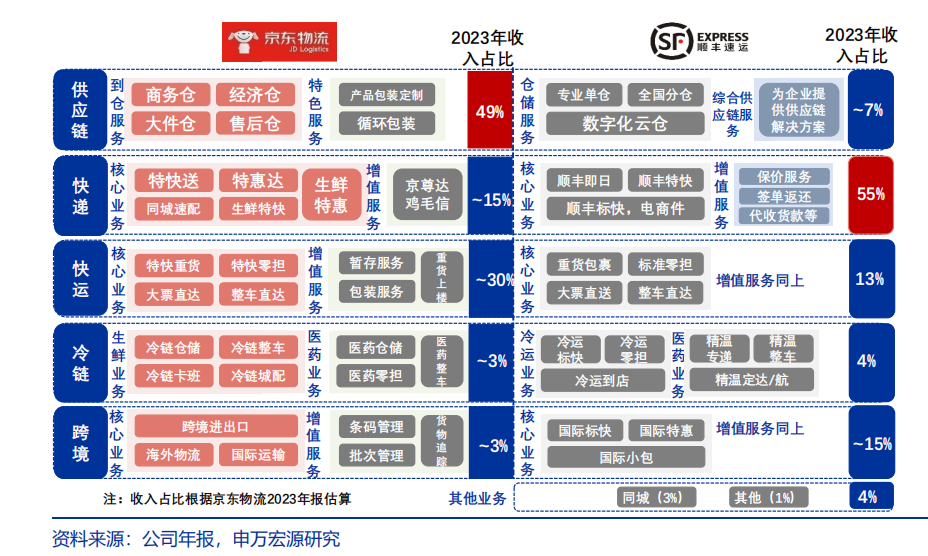 这张图清晰地展示了京东物流与顺丰的最大区别:顺丰的核心业务就是快递,而京东物流的核心业务是供应链,营收占比约50%。
