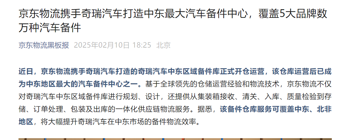 依托先进的物流管理体系及优化的仓库结构设计,奇瑞汽车中东区域备件库的处理效率实现了大幅飞跃,最快可实现2-4小时内完成备货,显著缩短了出库周期,能够为客户、消费者带来了更加快捷、高效的服务体验。
