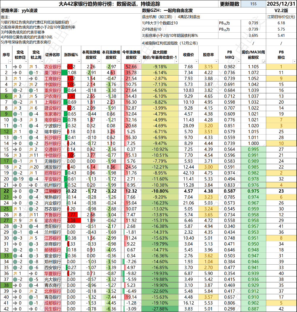 42只银行趋势榜,江阴升至第3名,苏农第9名,无锡第11名,张家港第18名。农商行开始起色。