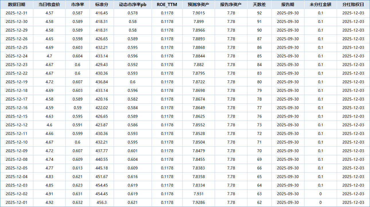 2025年收4.57元,每股净资产7.68元,PB0.595