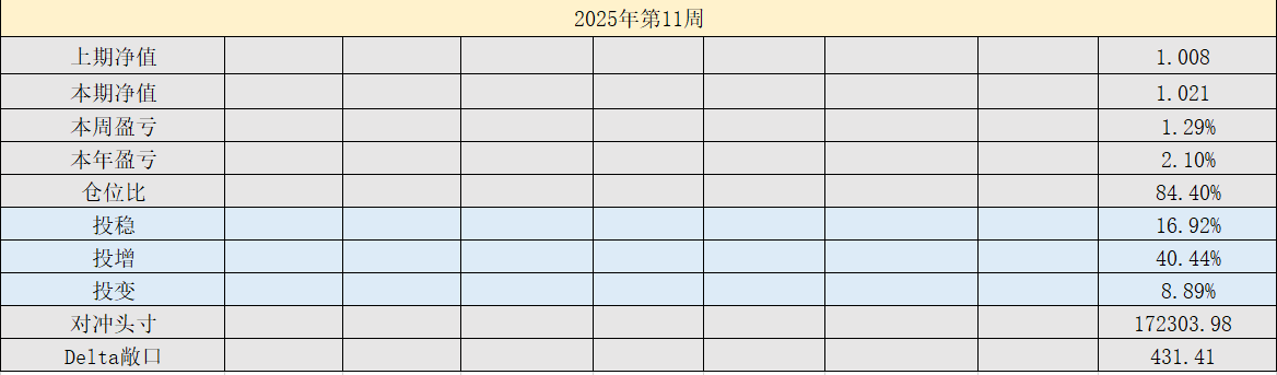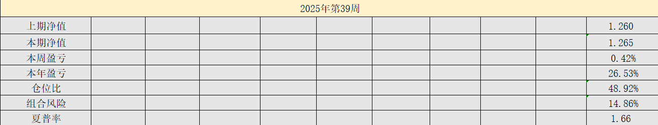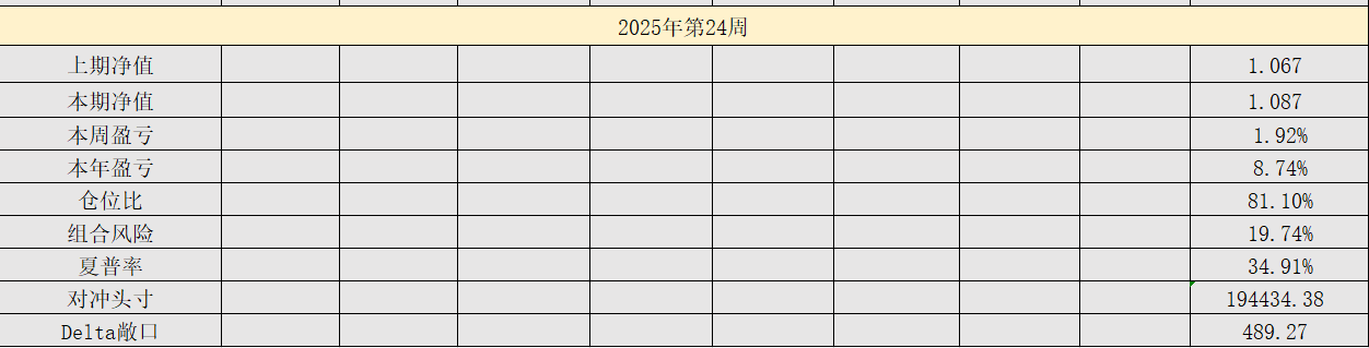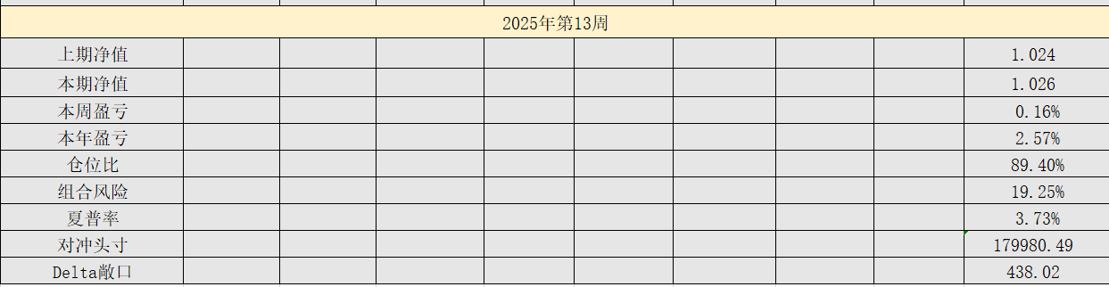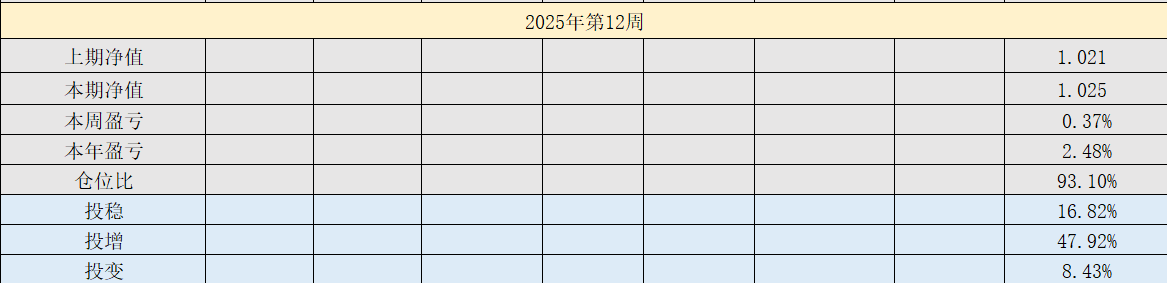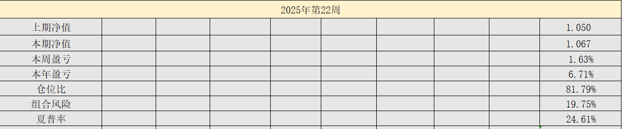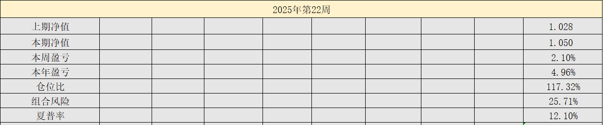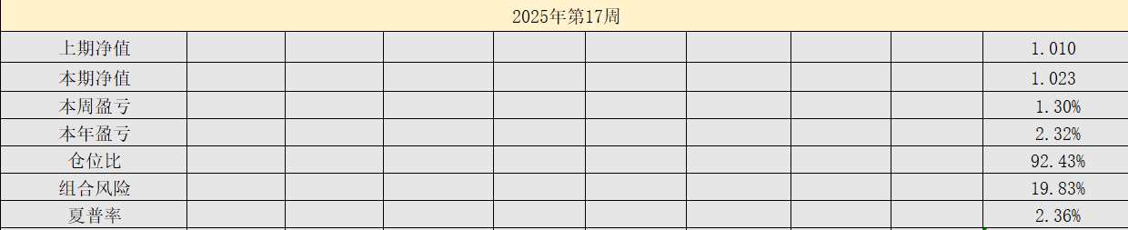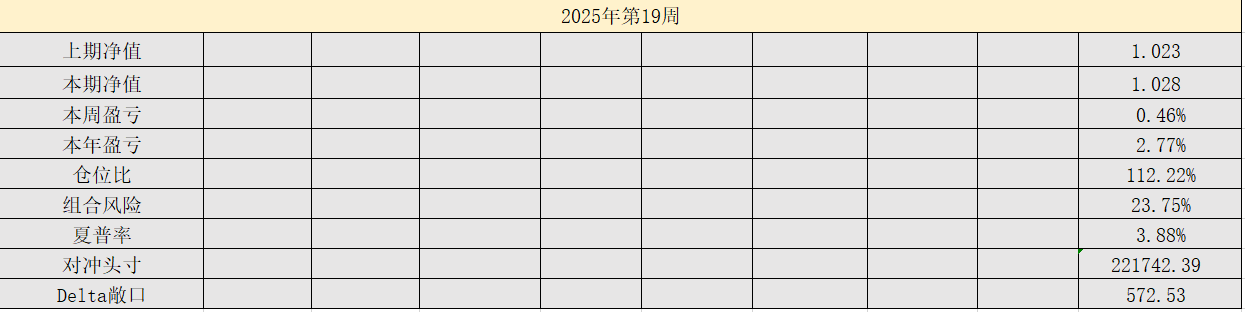 2025年19周,净值:1.028,本周盈亏:0.45%,本年盈亏:2.76%,总仓位:115%