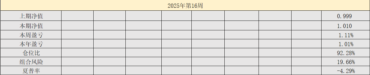 2025年16周,净值:1.01,本周盈亏:1.11%,本年盈亏:1.01%,总仓位:92%关注两种机会:1. 中美关税问题缓和的可能性,短期应该不会有更差的情况发生。2. 国内在消费,包括出口转内销的进一步刺激动作。