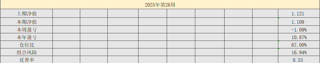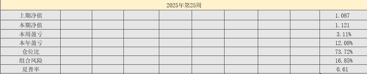 2025年26周,净值:1.109,本周盈亏:-1.09%,本年盈亏:10.87%,总仓位:67%网商银行给了几个理财红包,20w减240,选择7天理财产品,年化差不多8%。把场内的子弹挪出去一部分,这几个红包吃掉再回来。我判断6月下旬到7月中报披露完,资金都以防守为主,本周行情也表明场内落袋情绪比较强,一些基本面还可以,中报利润可能有增长的个股,一波买上去马上会被锁定利润,根本没有持续意愿。