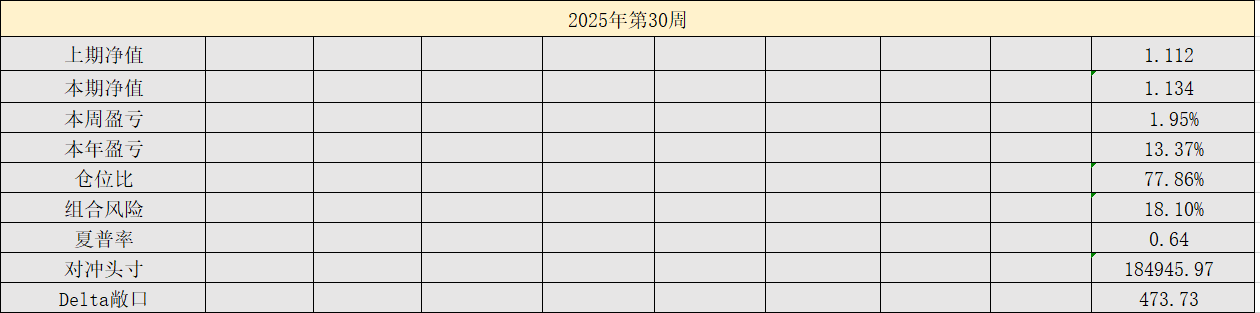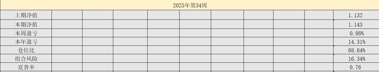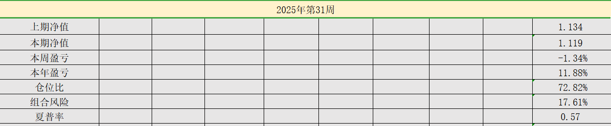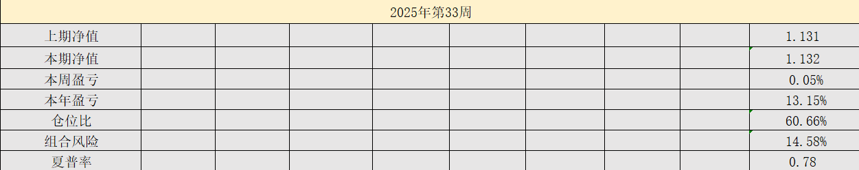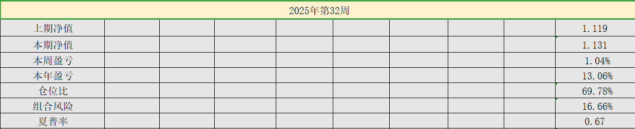 2025年32周,净值:1.131,本周盈亏:1.04%,本年盈亏:13.06%,总仓位:70%