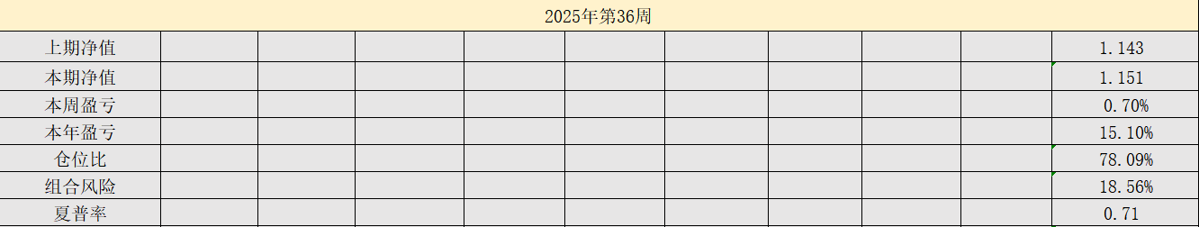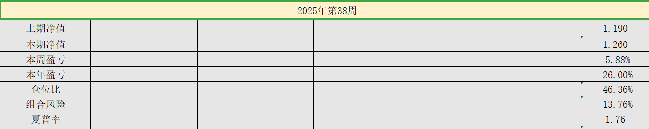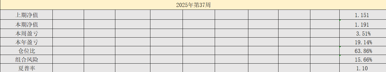 2025年37周,净值:1.190,本周盈亏:3.5%,本年盈亏:19%,总仓位:64%本周港股高举高打,所有持仓未动,等9月份降息落地后再说。A股油运收复失地,逻辑是原油产量上升,油运轮次增加,借势减持海油,加仓油运。错过了铜铝,错过了半导体,所幸在消费电子上吃了一点点肉。