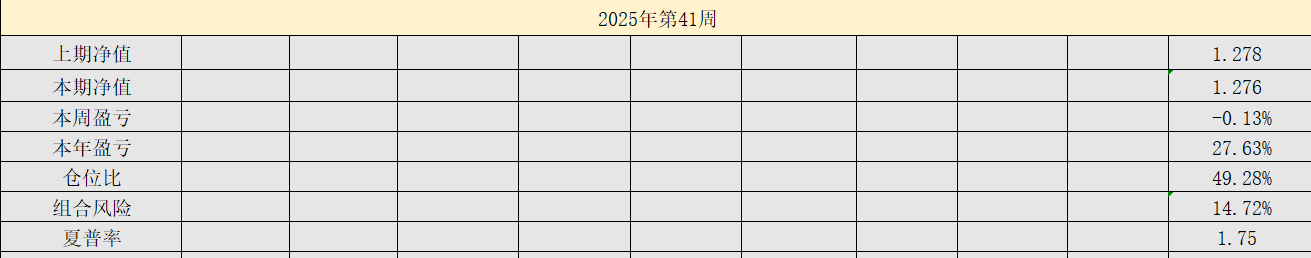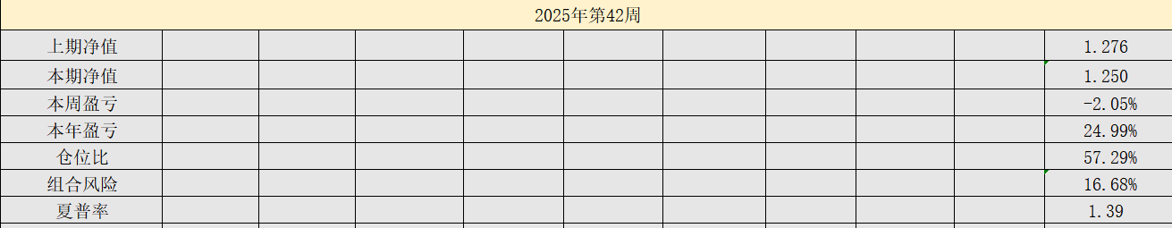 2025年42周,净值:1.250,本周盈亏:-2.05%,本年盈亏:24.9%,总仓位:57%不愧是大牛市,本色还在,没有足够对等做空机制,涨要一起,跌也得一起,齐齐整整。美国危机,引发全球危机,全球危机会带动港股危机,我们先跌没毛病。
