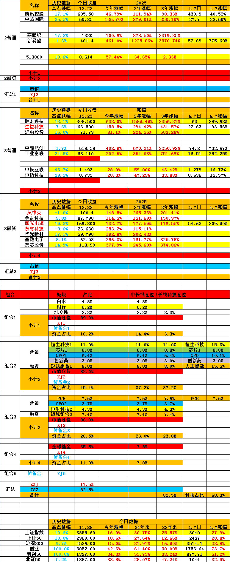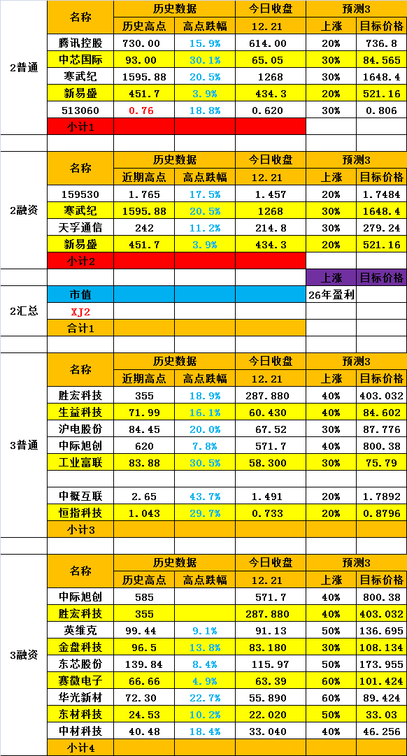 组合3:腾讯+中芯国际+寒武纪+恒生医疗+新易盛(中线+短线)