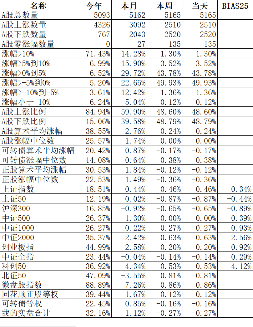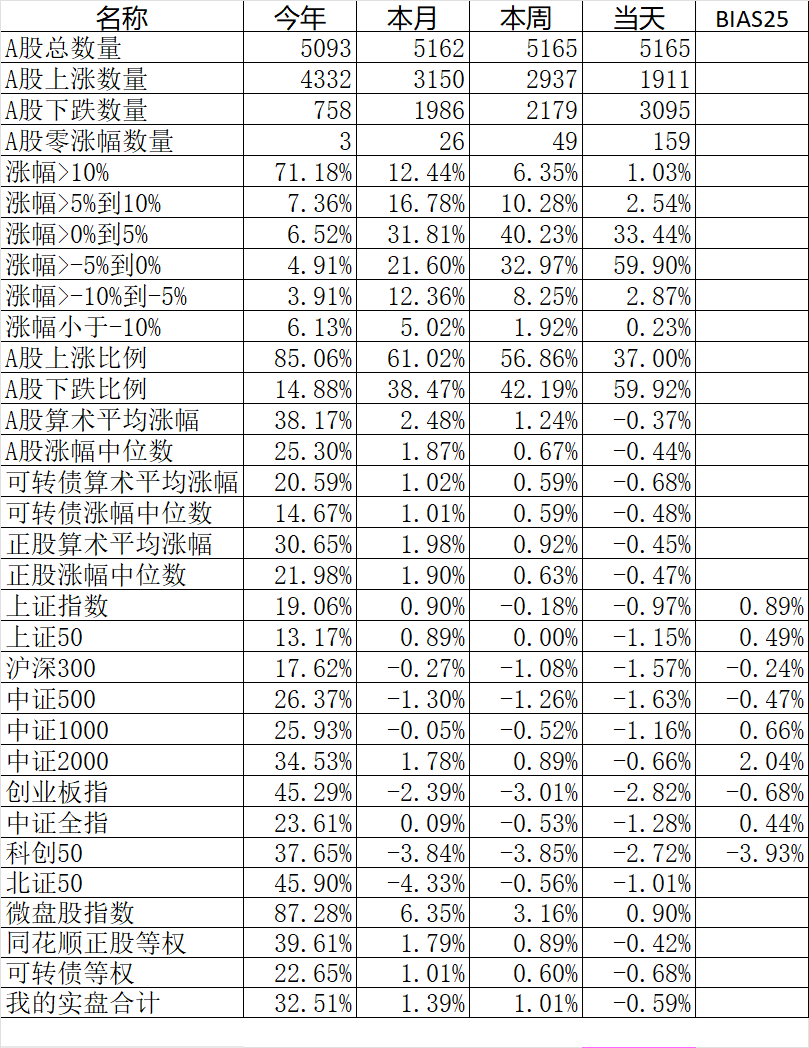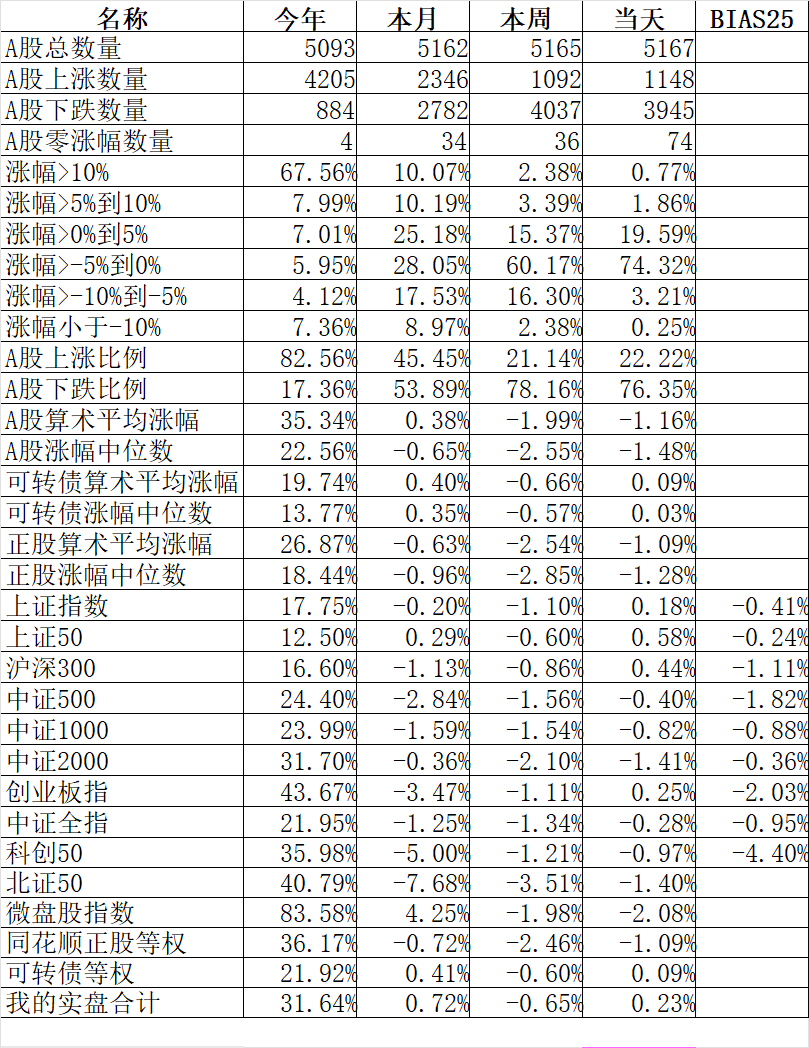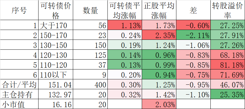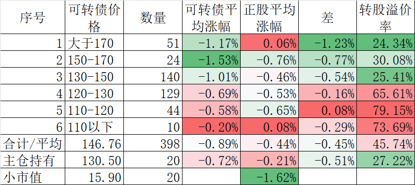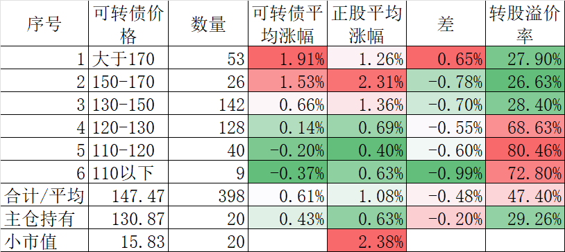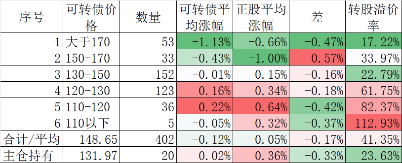 402只可转债平均下跌0.12,对应正股平均上涨0.05%。我的主仓20只可转债平均上涨0.02%,对应正股平均上涨0.36%。