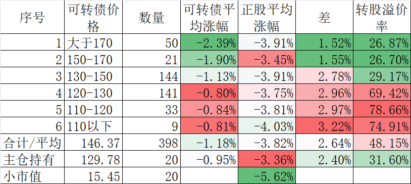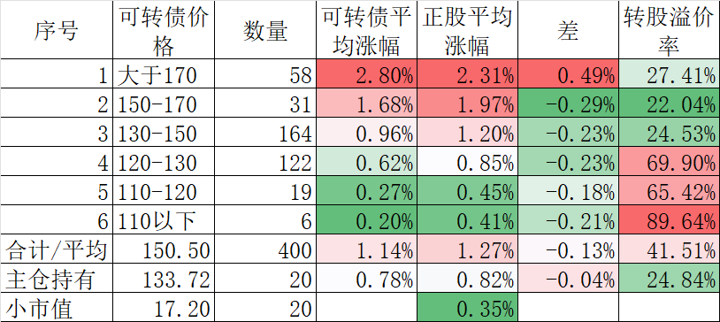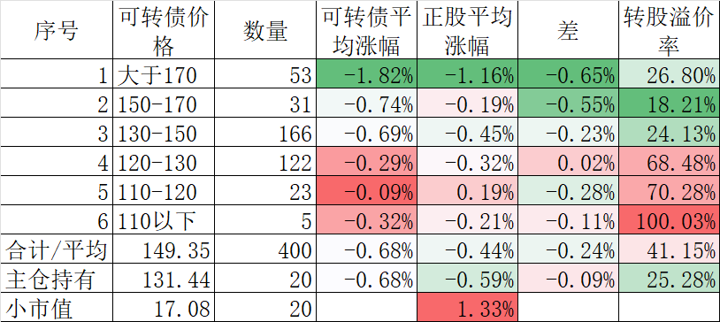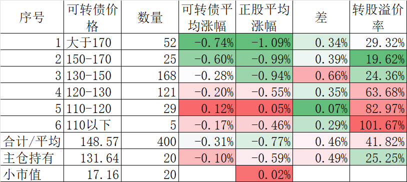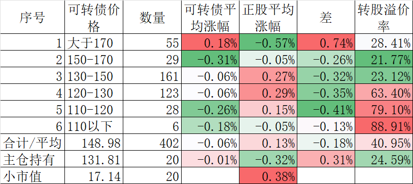 400只可转债平均下跌0.31%,对应正股平均下跌0.77%。我的主仓20只可转债平均下跌0.10%,对应正股平均下跌0.59%。