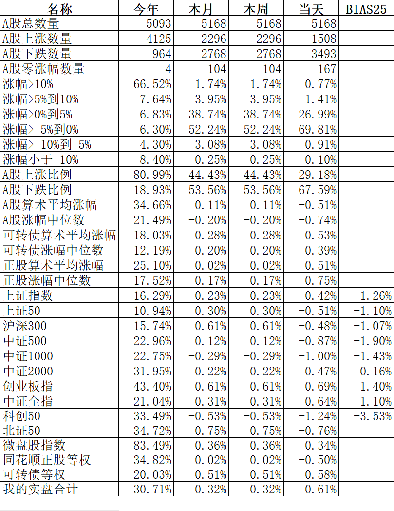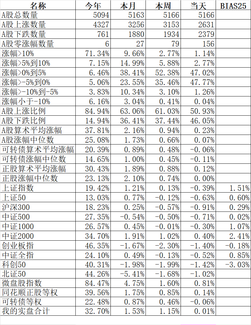 虽然今天的操作有超额,但还是亏损,而且连亏了3天。今天虽然大部分个股是下跌的,但大部分指数却是上涨的。正是应了李清照的词:“知否知否,应是绿肥红瘦?”