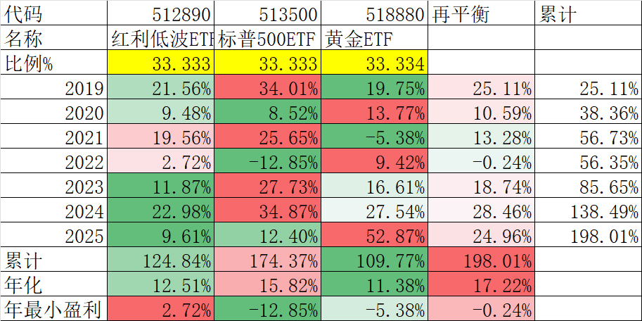 我在雪球上有个由红利低波ETF(512890)、标普500ETF(513500)、黄金ETF(518880)三个ETF等权组成的组合,仅仅每年做一次再平衡: