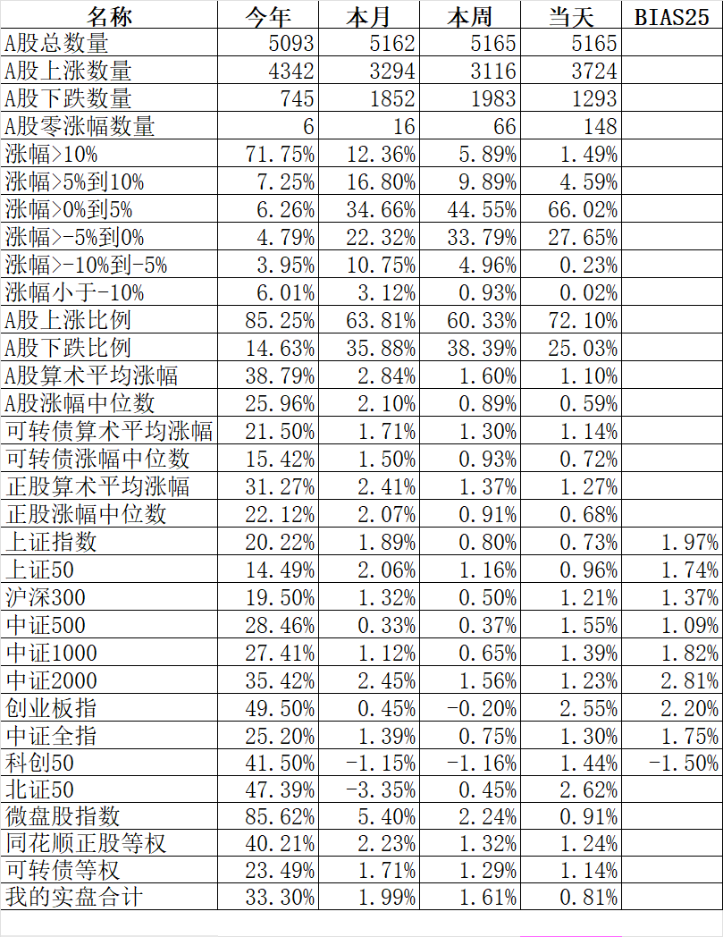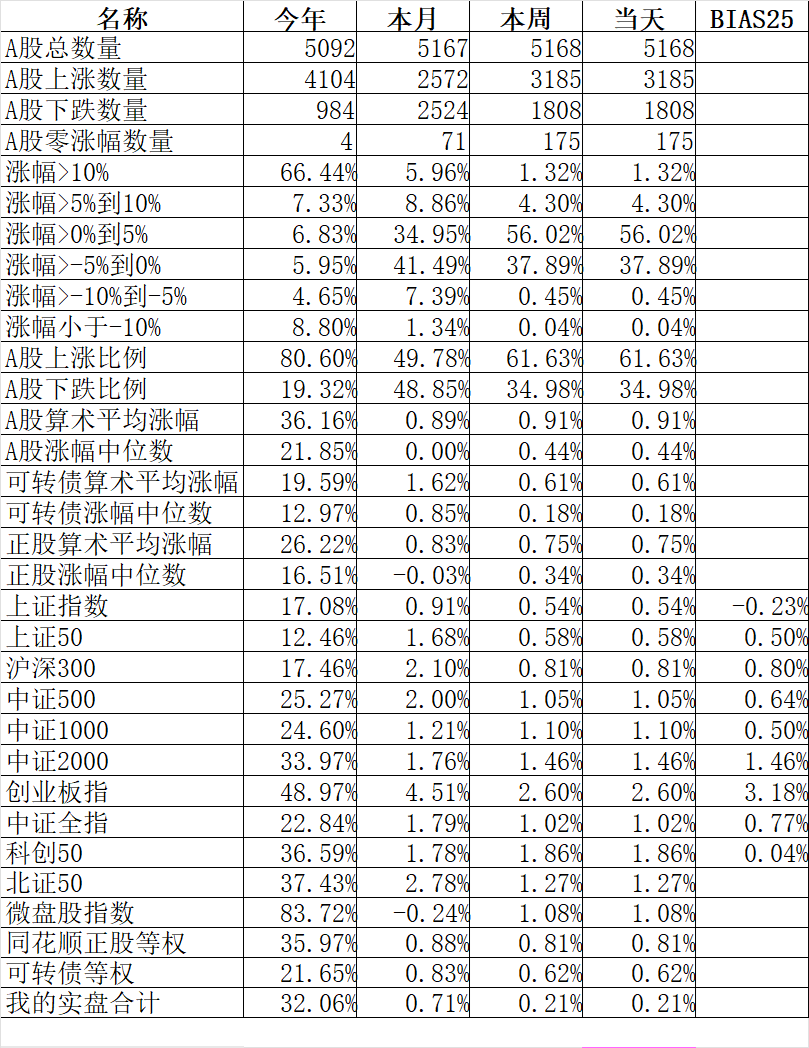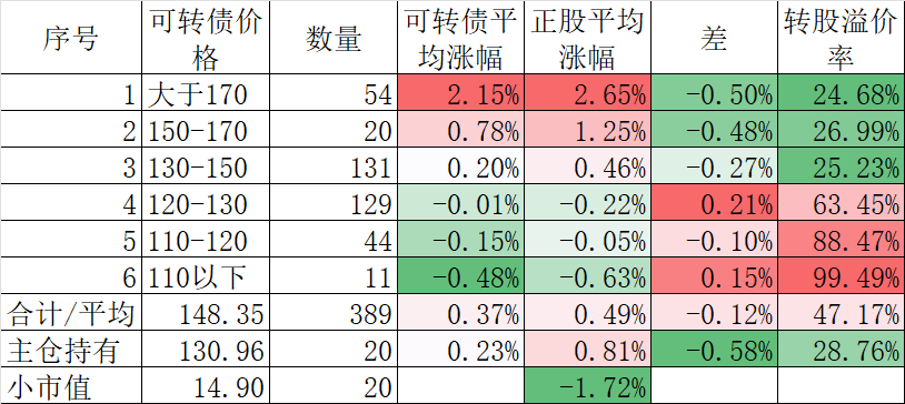 402只可转债平均上涨0.52%,对应正股平均上涨0.74%。我的主仓20只可转债平均上涨1.19%,对应正股平均上涨1.63%。