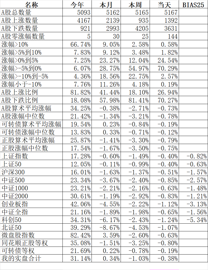 395只可转债平均下跌0.17%,对应正股平均下跌0.72%。我的20只可转债平均下跌0.27%,对应正股平均下跌0.57%。
