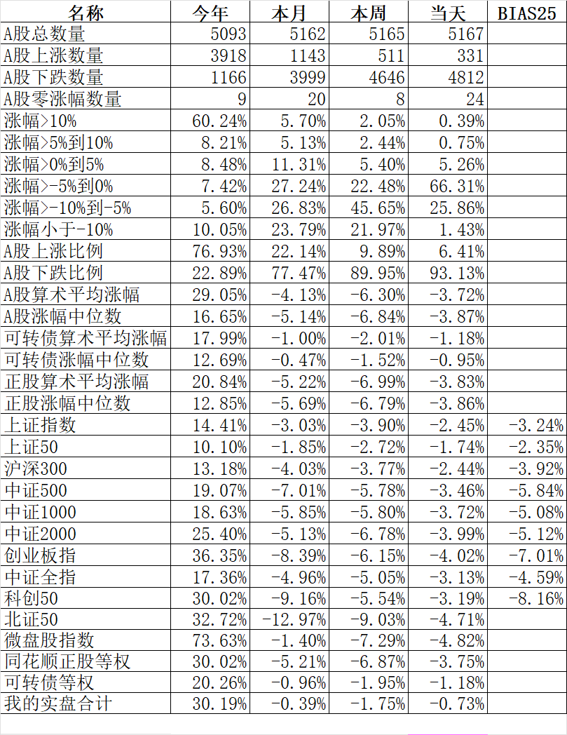 上了4000点,这个慢牛够慢的。今天大部分指数普跌,只有北证50和微盘股是上涨的。 主流宽基指数中领涨的北证50涨0.19%、微盘股指数涨0.12%;领跌的科创50跌1.47%、创业板指跌0.51%。申万一级行业指数中领涨的基础化工涨2.39%、综合涨1.45%、石油石化涨1.38%;领跌的计算机跌1.83%、电子跌1.34%、家用电器跌1.17%。2032只个股上涨,2953只个股下跌,涨幅中...结果是过程带来的 需要每个月识别有效机会并抓住,但很多机会好买点只有几分钟。机会其实还是蛮难识别的。目前转债机会感觉少很多。交易量一直七百左右。还是科技股回调时候机会更多。