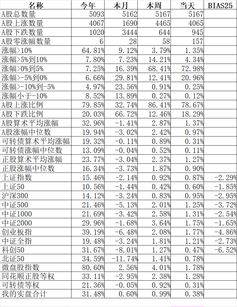 395只可转债平均上涨0.07%,对应正股平均上涨0.48%。我的20只可转债平均上涨0.24%,对应正股平均上涨0.57%。