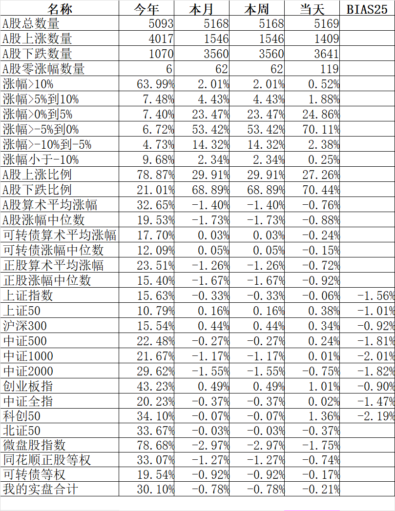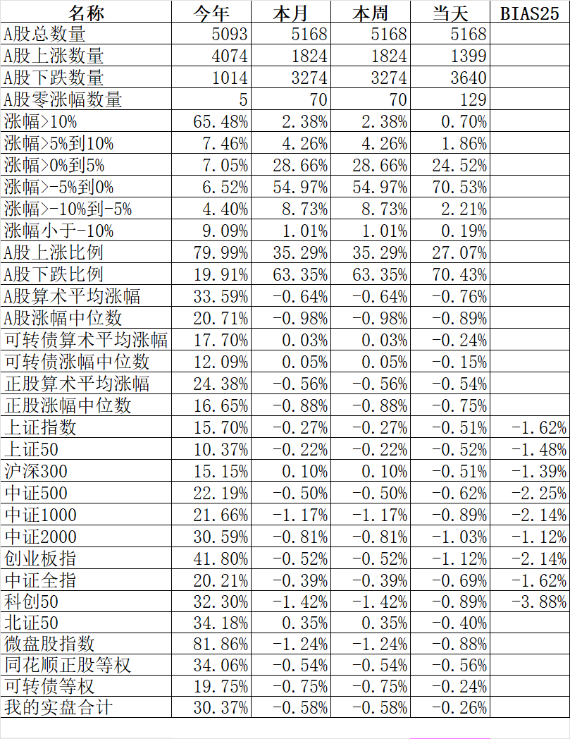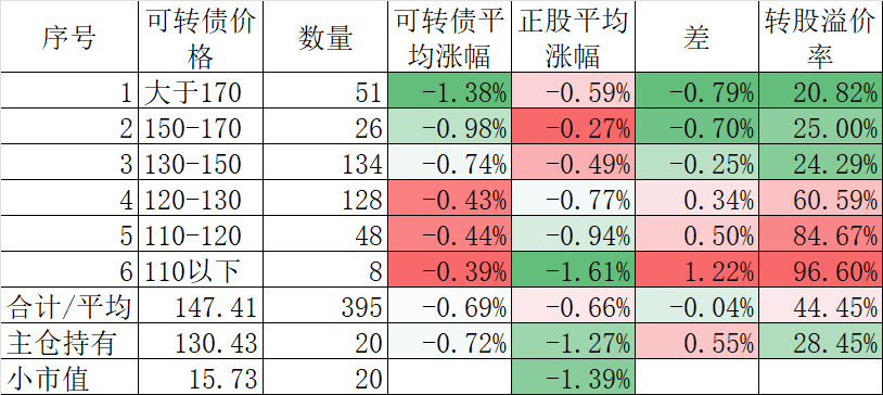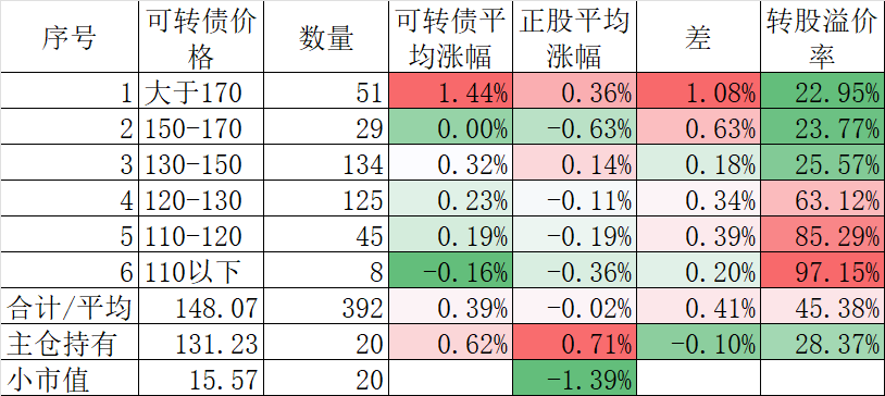 402只可转债平均下跌0.06%,对应正股平均上涨0.13%。我的主仓20只可转债平均下跌0.01%,对应正股平均下跌0.32%。