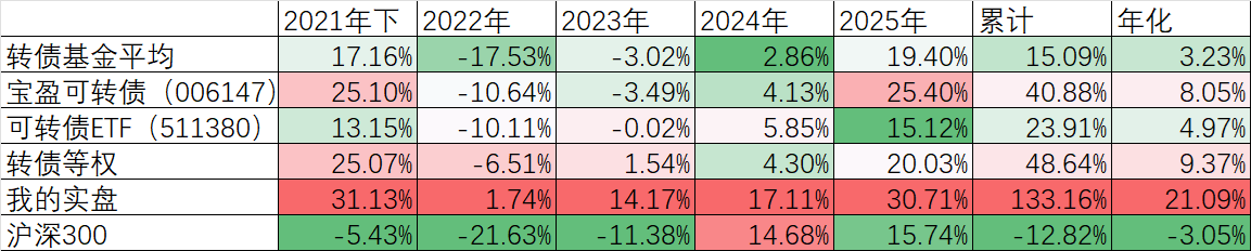 今天有人说起可转债基金是否可以替代可转债的轮动。我是2021年下半年清仓茅台等白马股换入可转债轮动的,那我就从2021年7月1日统计到2025年12月2日(之所以统计到昨天,是因为基金今天的净值还没有出来):