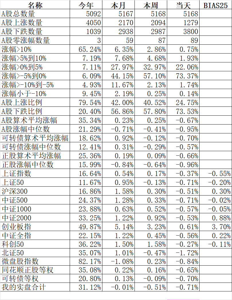 上了4000点,这个慢牛够慢的。今天大部分指数普跌,只有北证50和微盘股是上涨的。 主流宽基指数中领涨的北证50涨0.19%、微盘股指数涨0.12%;领跌的科创50跌1.47%、创业板指跌0.51%。申万一级行业指数中领涨的基础化工涨2.39%、综合涨1.45%、石油石化涨1.38%;领跌的计算机跌1.83%、电子跌1.34%、家用电器跌1.17%。2032只个股上涨,2953只个股下跌,涨幅中...