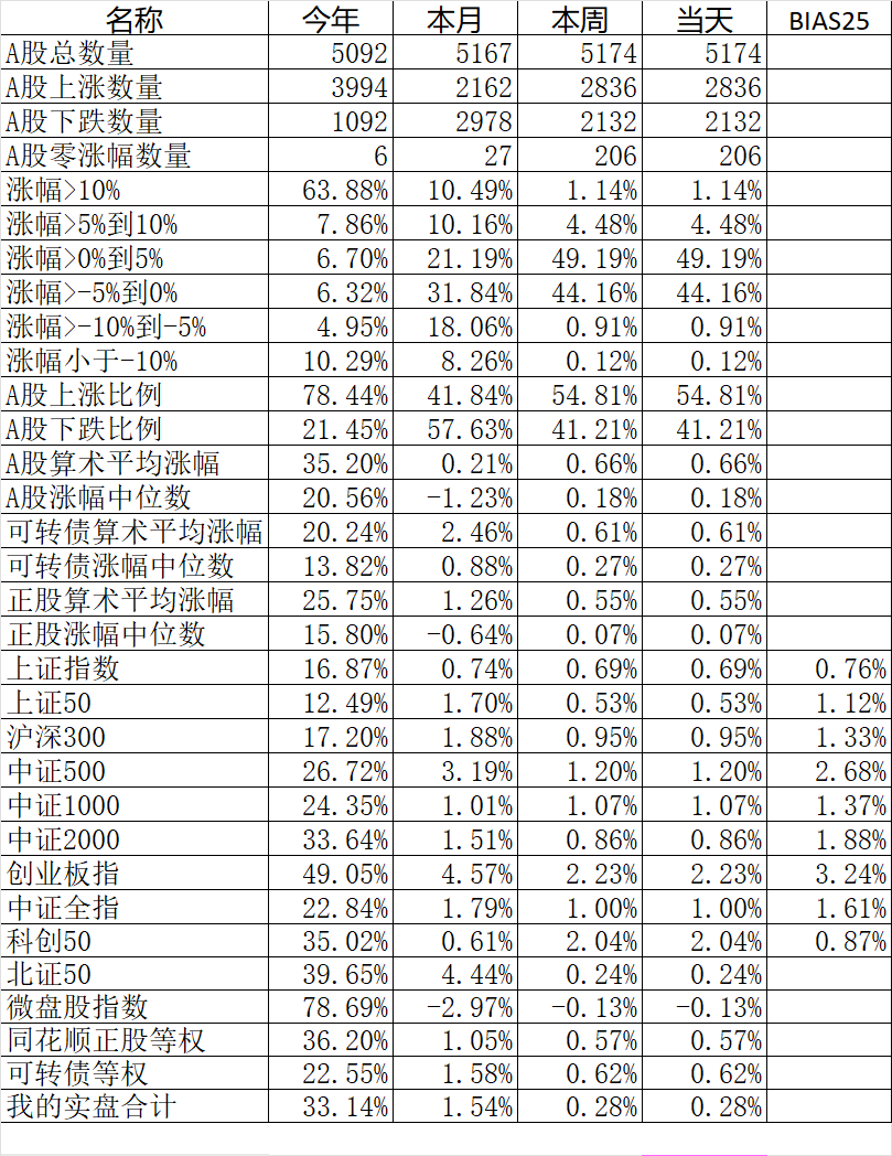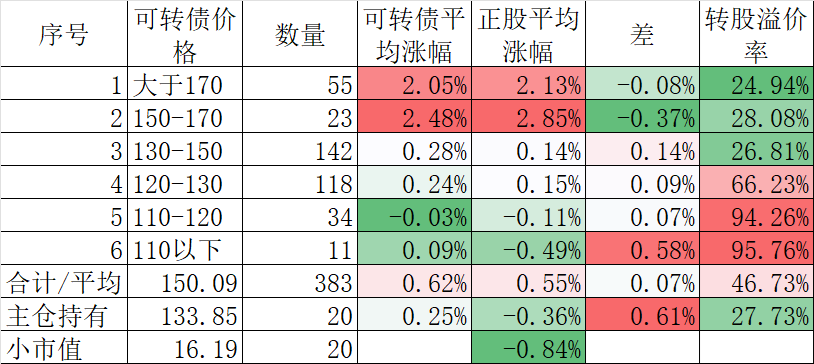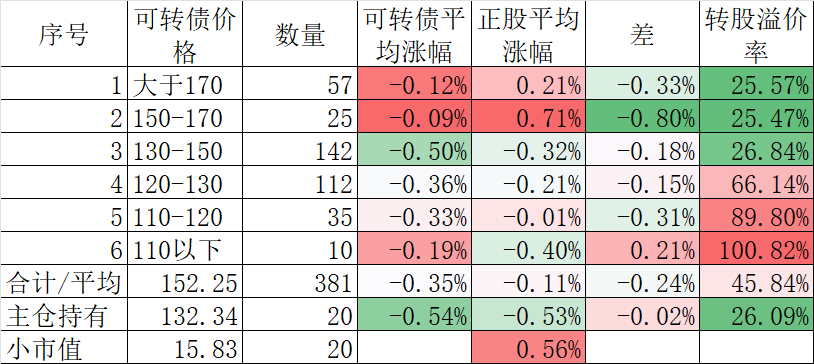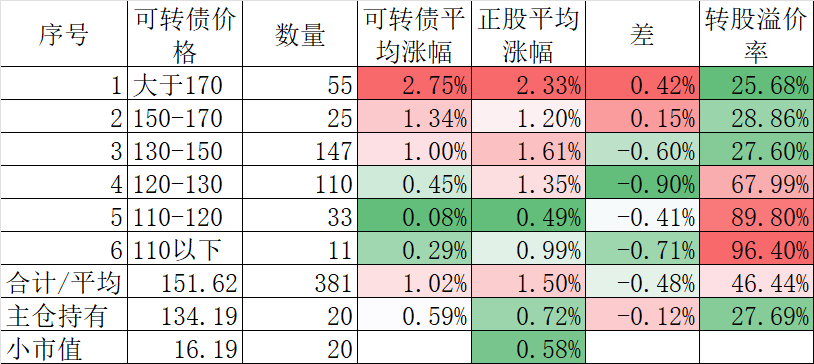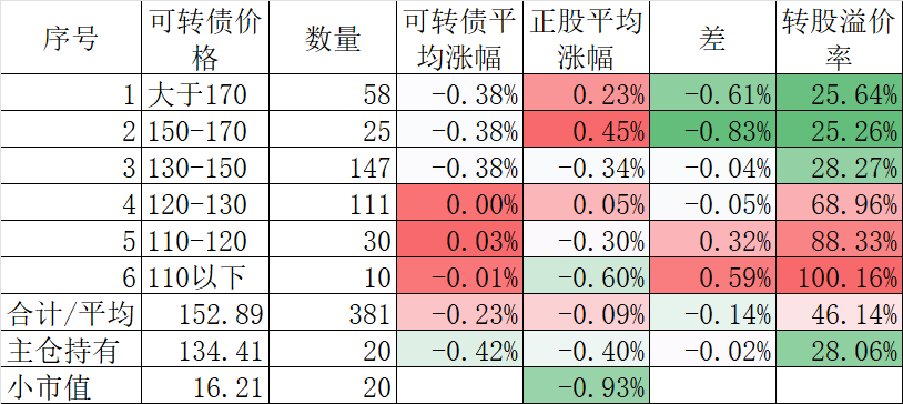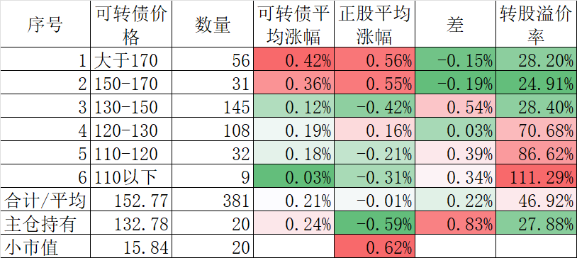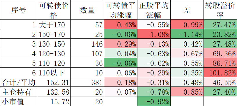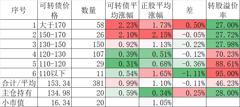 400只可转债平均上涨0.30%,对应正股平均上涨1.25%。我的主仓20只可转债平均上涨0.32%,对应正股平均上涨1.42%。