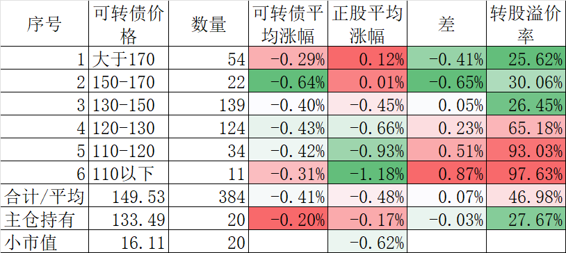 398只可转债平均下跌1.18%,对应正股平均下跌3.82%;我的主仓20只可转债平均下跌0.95%,对应正股平均下跌3.36%。