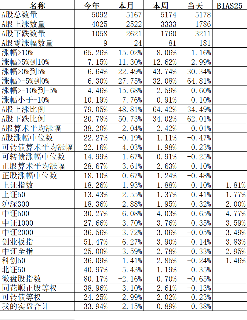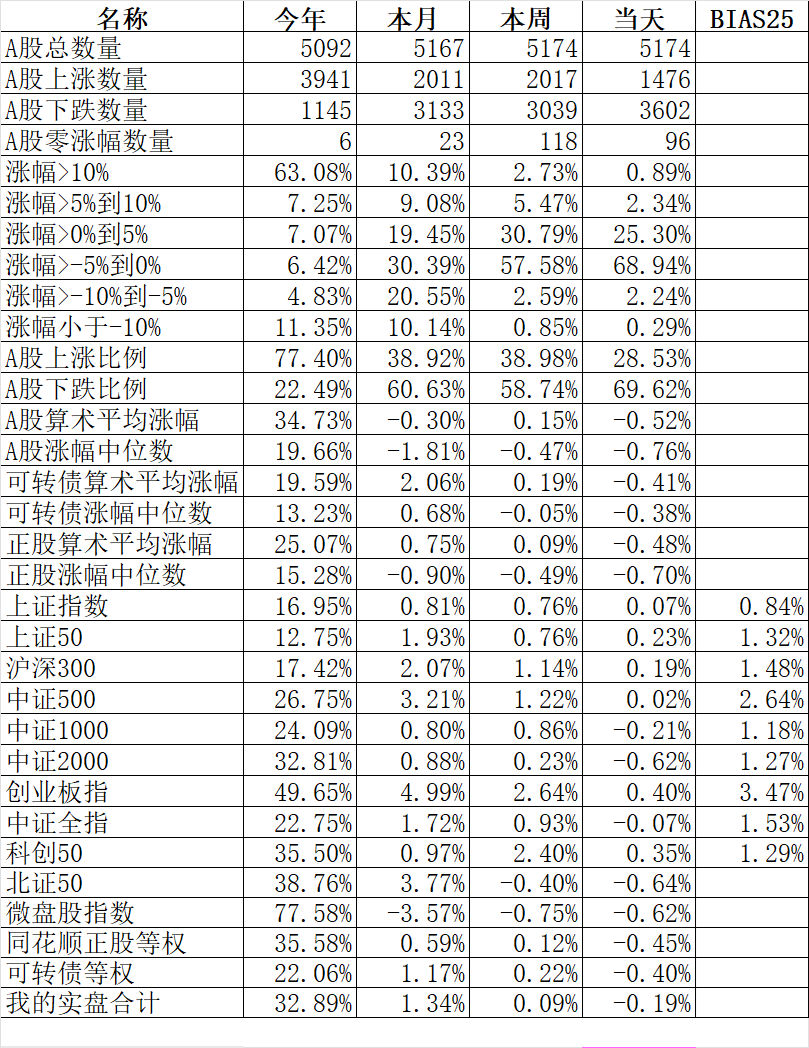 1954只个股上涨、3087只个股下跌,涨幅中位数-0.38%。