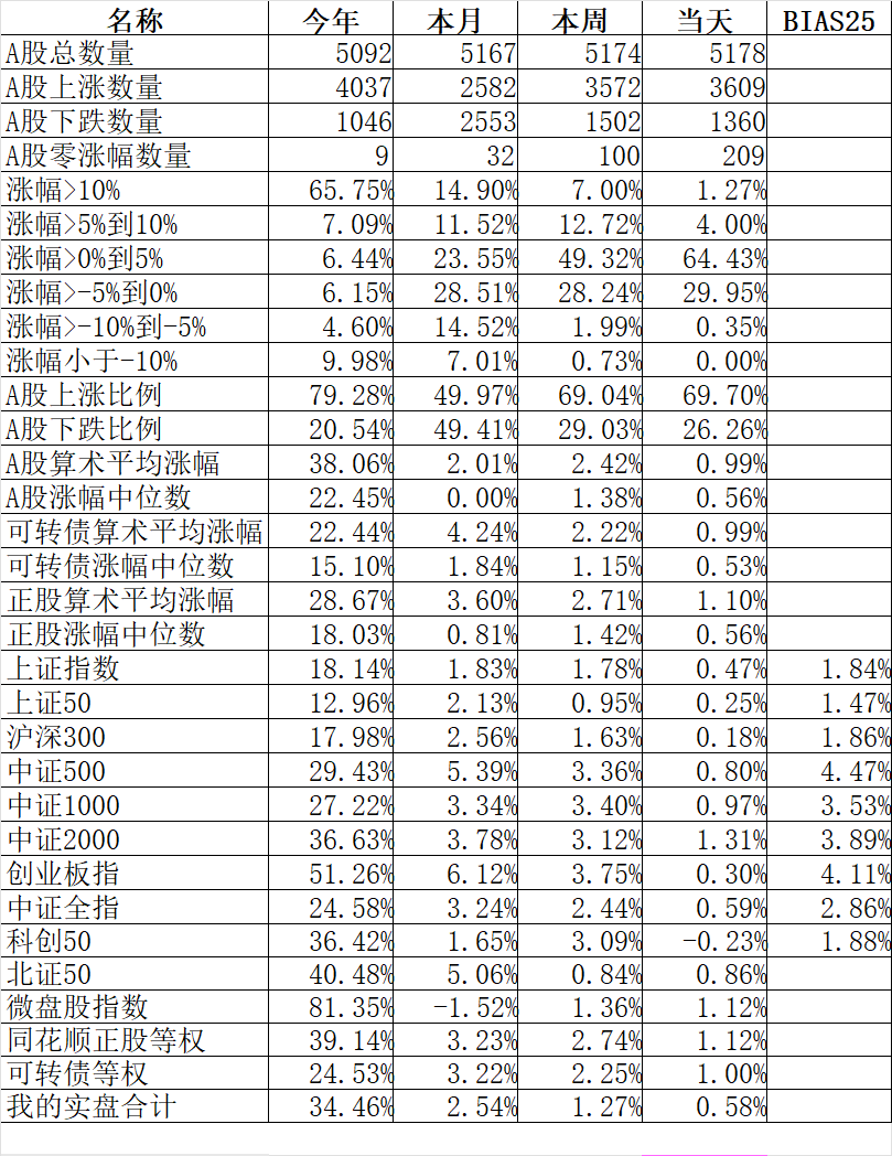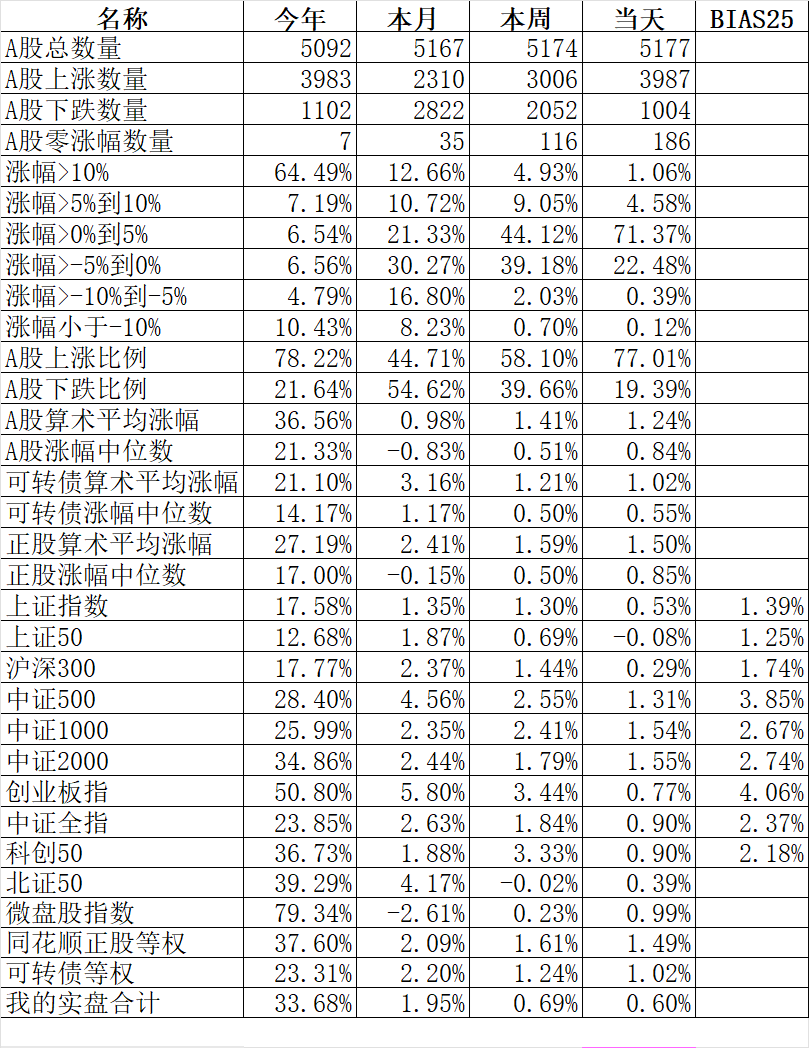 4007只个股上涨、1048只个股下跌,涨幅中位数1.35%。