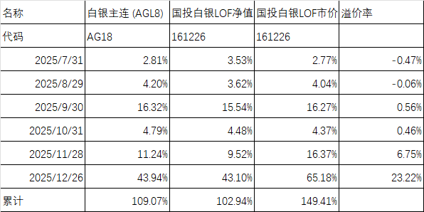 从最近半年来看,白银主连上涨了109.07%,而白银LOF净值上涨102.94%,市价则大涨了149.41%。从溢价率来看,10月份前基本上市价和净值的涨幅是同步的,到11月底溢价率到了6.75%,而到了12月26日,溢价率到了23.22%。溢价率最高的12月24日高达61.64%