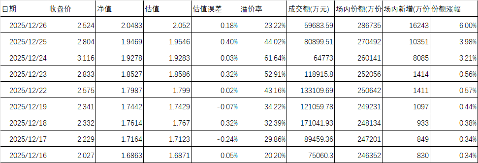 12月26日,场内成交了5.97亿元,我们如果假定12月24日申购的8085万份全部卖出,那么总金额=2.524*8085=2.04亿元,占了当天成交的34.17%。其他65.83%是过去几天申购和场内老的份额,甚至也会有前几天高位接盘割肉的。