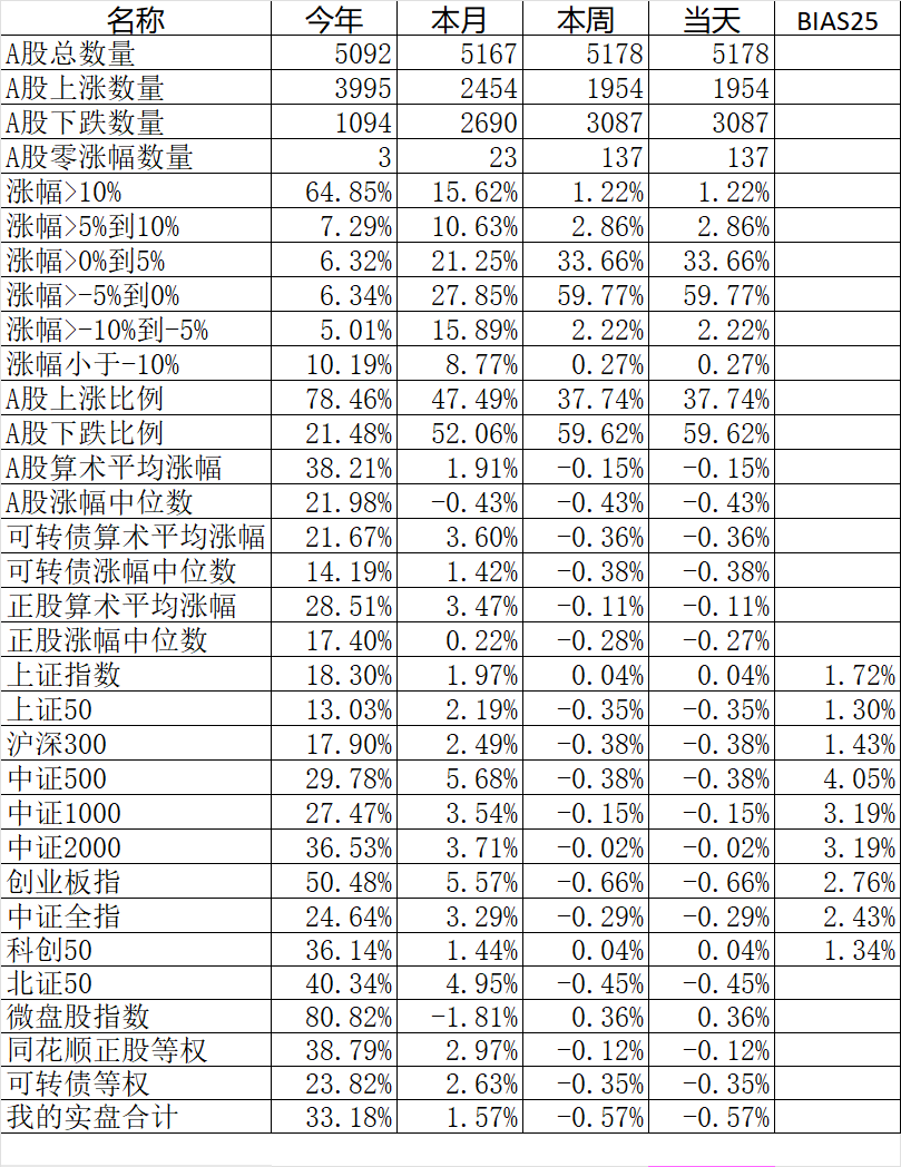381只可转债平均上涨0.18%,对应正股平均下跌0.31%。我的20只可转债平均上涨0.07%,对应正股平均下跌0.78%。