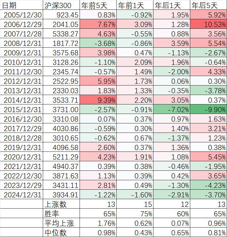 最后再看看从2005年到2024年这20年来的沪深300指数在年前年后的上涨情况,不管是从胜率、平均涨幅还是中位数,都是相对乐观的,希望能安全度过今年最后两个交易日: